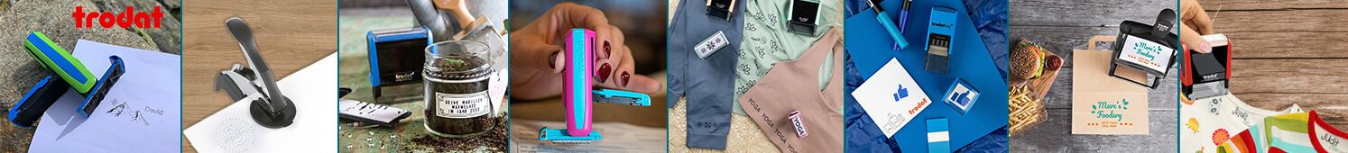 incluir nombres, logotipos, direcciones y firmas, así como elegir entre diferentes mecanismos y formatos: sellos automáticos o manuales, redondos o rectangulares. También cuentan con los clásicos sellos fechadores que muchos hemos utilizado, dando la opción de personalizar el formato de fecha, y prensas de sello en seco con las que hacer impresiones en relieve sobre el papel u otros materiales. En cualquiera de estos casos, los productos Trodat ofrecen una