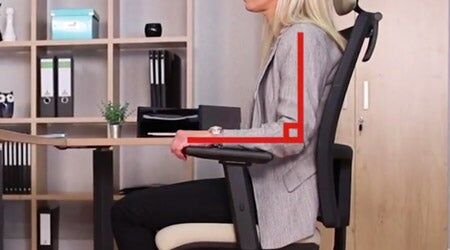 Siéntate en posición bien recta y dobla tus brazos en ángulo recto. Regula la altura de los reposabrazos hasta que toquen ligeramente la parte inferior de tus codos.