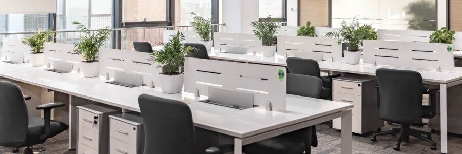 Las mamparas divisorias son una solución tradicional que suele estar disponible en multitud de materiales y diseños, incluso las hay con regulación de altura. Su objetivo no es otro que ofrecer una separación visual y acústica del espacio sin hacer cambios ni en las paredes ni en la estructura de la oficina.