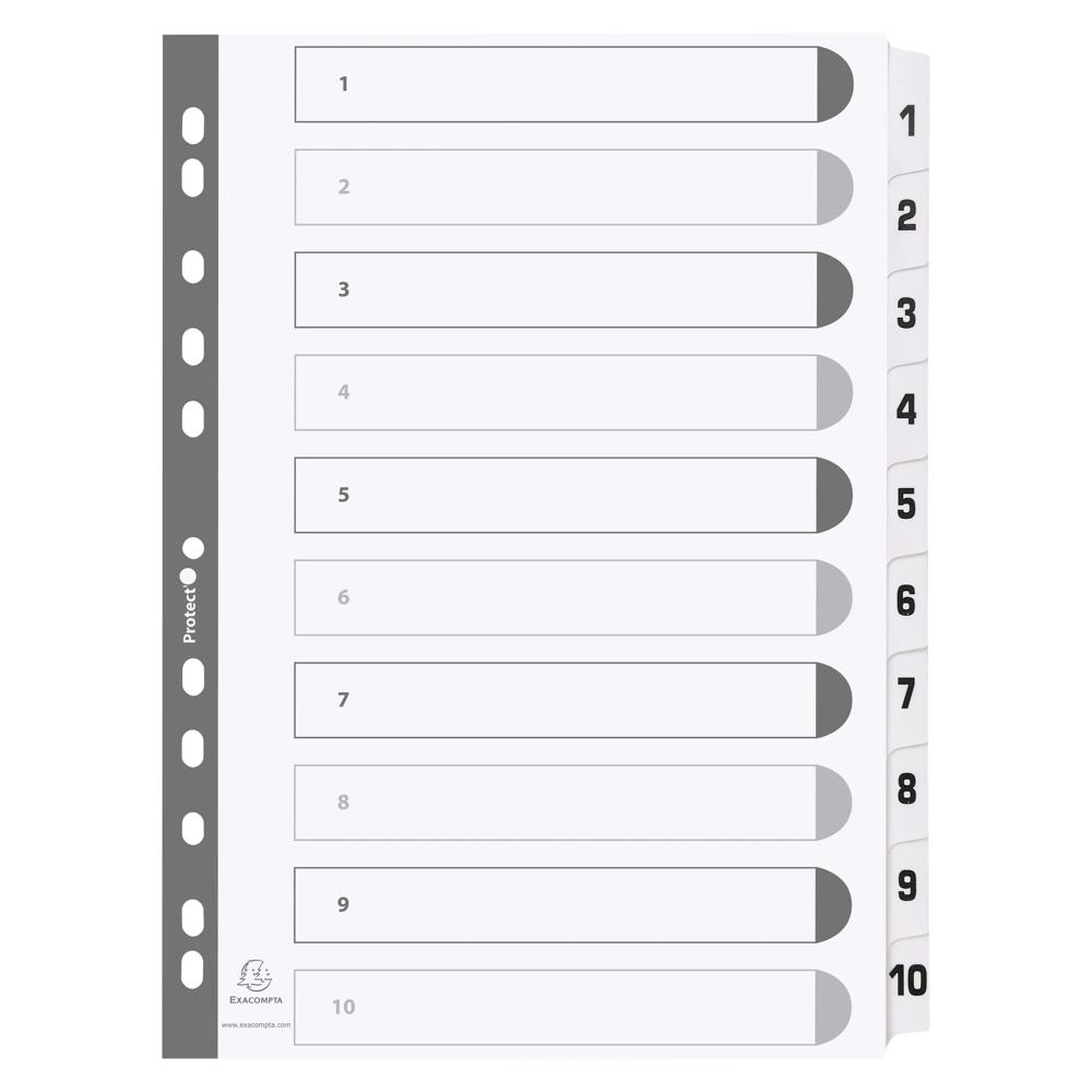 Separadores con pestañas impresas cartulina blanca 160 g/m 2 Página de índice reforzada e imprimible gratis con Kreaman® en www.exacompta.com. Además, las perforaciones y pestañas blancas están plastificadas y reforzadas. Pestañas: 10 posicones de la 1 a la 10 Posiciones: 10 - Para archivar: A4 (22,3x29,7cm) Certificación FSC®, otorgado por una organización independiente cuyo objetivo es promover un modelo de gestión de bosques responsables para las generaciones actuales y futuras, y cumple con la normativa ISO 9706, la cual mide y garantiza la resistencia del papel al envejecimiento. Así los artículos de clasificación y archivo fabricados en papel o cartulina cuentan con una larga vida útil.