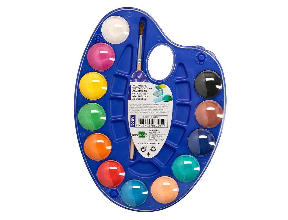 Descripción detalladaAcuarelas diluibles en agua. Paleta de plástico que incluye pincel y depósito para mezclar los colores con agua. Perfecto para uso escolar. 12 colores surtidos. Colores vivos y cubrientes. No mancha. La paleta de plástico de 12 colores surtidos.