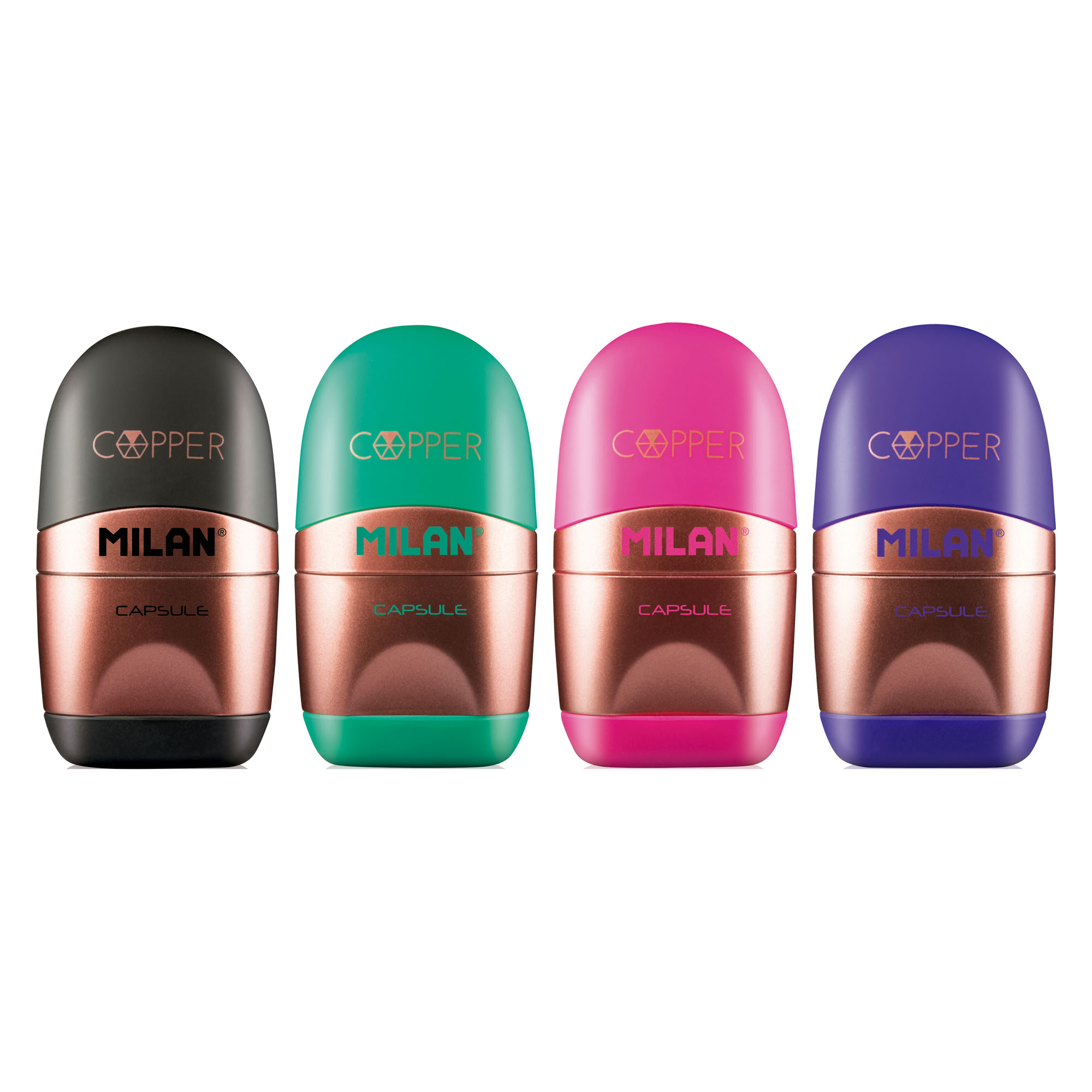 Descripción detalladaCombinación de goma y sacapuntas MILAN. Para borrar una amplia gama de lápices de grafito. No daña el papel. Combina el color cobre con negro, rosa, lila y verde. Colores surtidos aleatorios.