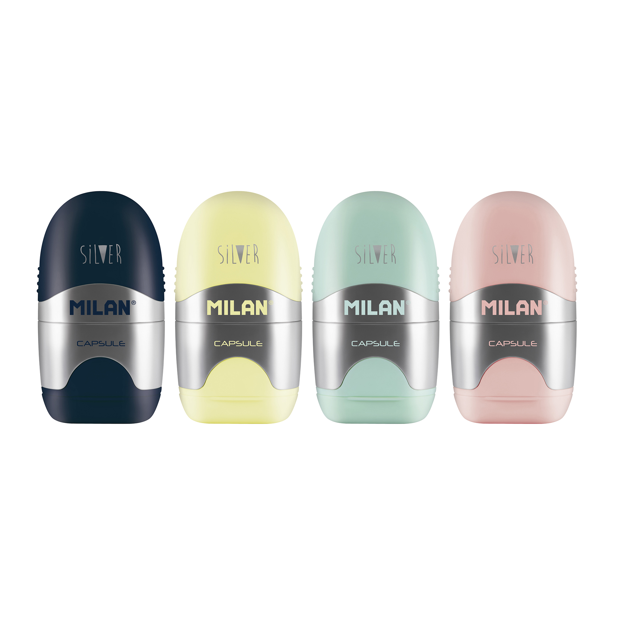 Descripción detalladaCombinación de goma y sacapuntas MILAN. Para borrar una amplia gama de lápices de grafito. No daña el papel. Combina el color plateado con delicados tonos pastel: amarillo, azul marino, rosa y turquesa. Colores surtidos aleatorios.