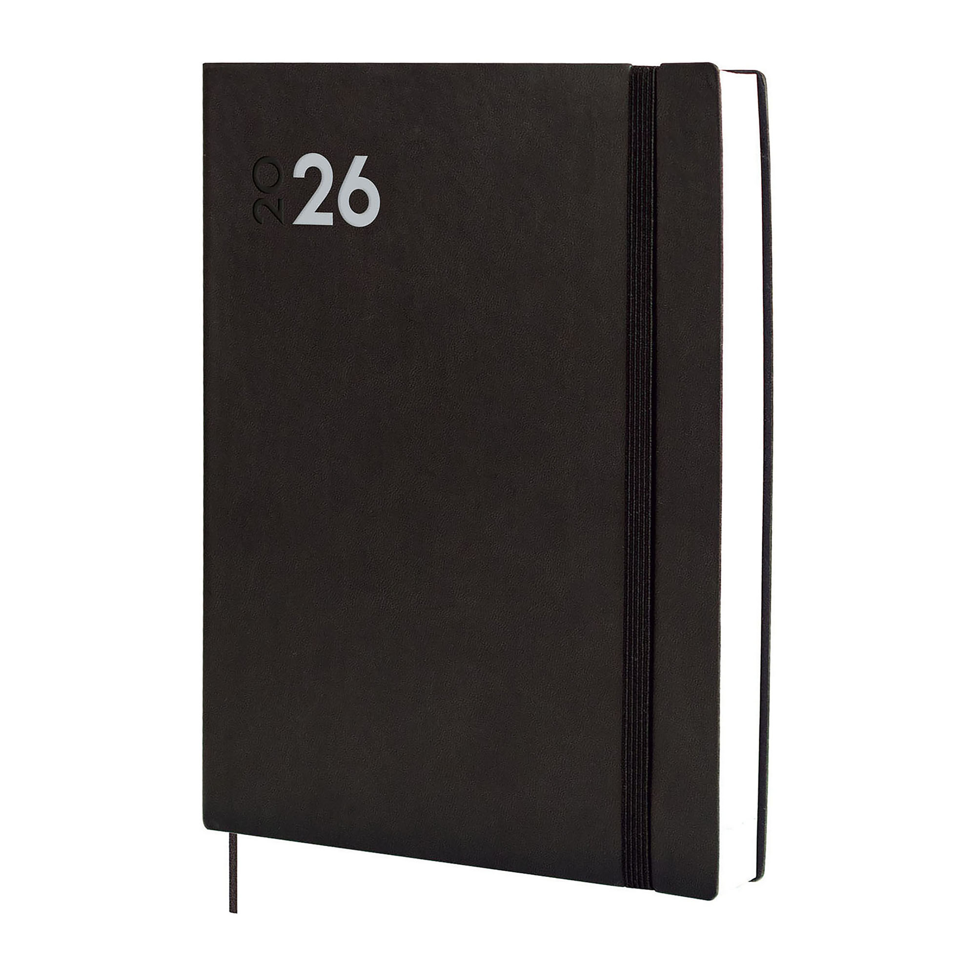 Agenda profesional encuadernada de tapa blanda y flexible de tacto muy suave y gomoso. De estilo moderno y universal. Apertura perfecta. Con goma elástica y cinta-punto.