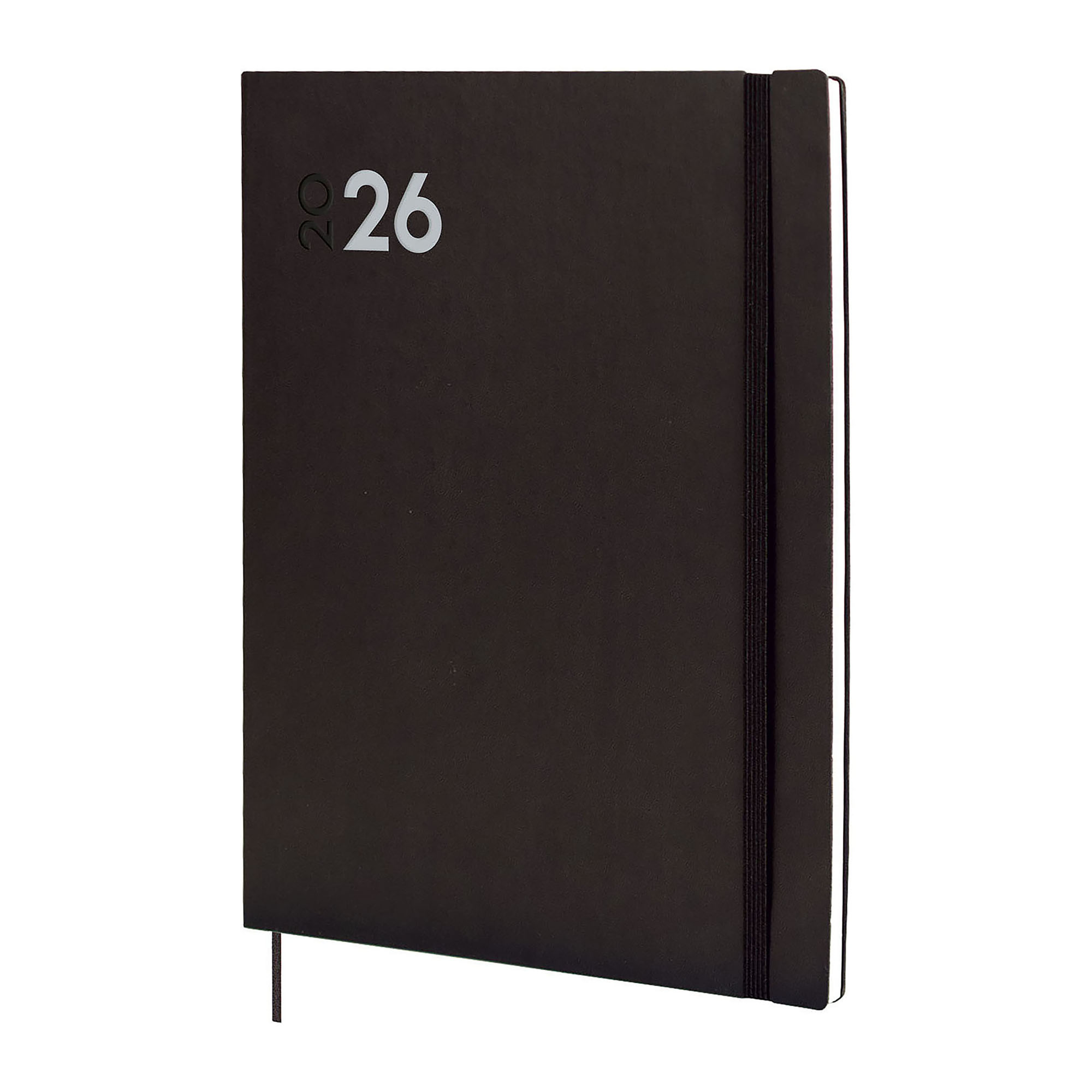 Agenda profesional encuadernada de tapa blanda y flexible de tacto muy suave y gomoso. De estilo moderno y universal. Apertura perfecta. Con goma elástica y cinta-punto.