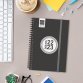 Material principal: Tapas de polipropileno. Espiral simple metálica. Papel de 70 g con certificado ecológico FSC.
