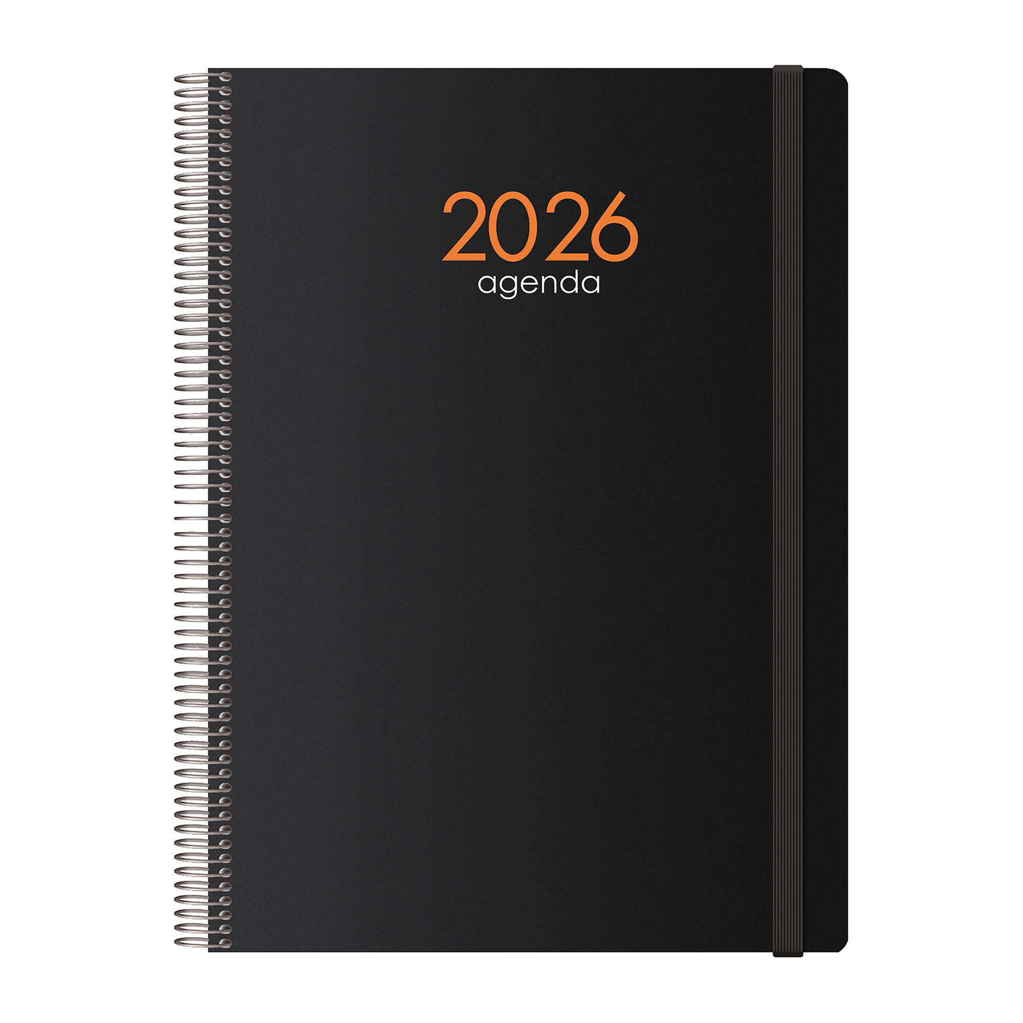 Encuadernación en espiral y tapa de polipropileno opaco con goma elástica.