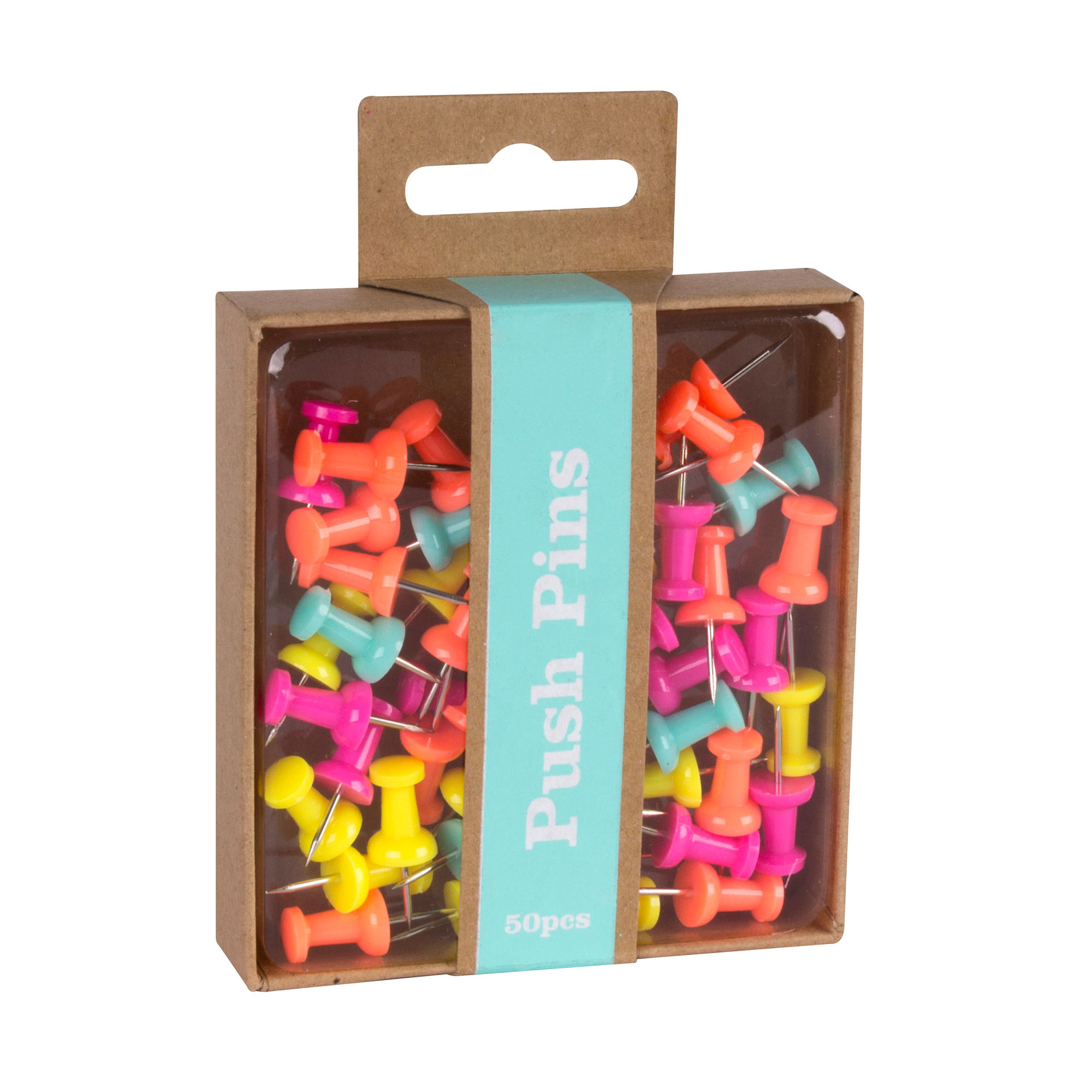 Descripción detalladaAgujas señalizadoras Push pins de la gama Fluor Collection. Caja de cartón kraft que incluye 50 chinchetas de colores fluorescentes surtidos: fucsia, amarillo, naranja y turquesa.