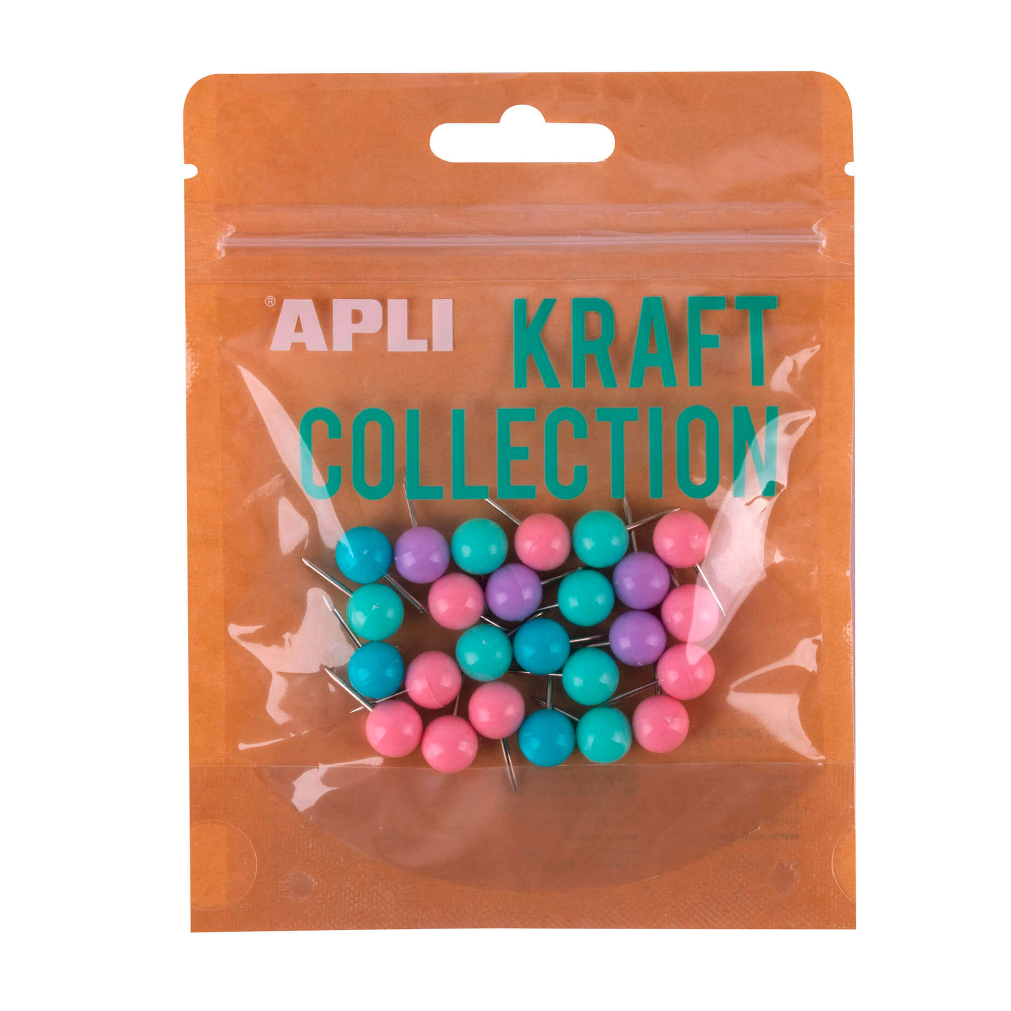 Bolsa de agujas push pins de la gama Kraft Collection. Bolsa Kraft con cierre zip que incluye 25 push pins en colores pastel surtidos: rosa, verde, lila y azul turquesa. Formato con un diseño moderno y llamativo para mantener tu escritorio a la última!