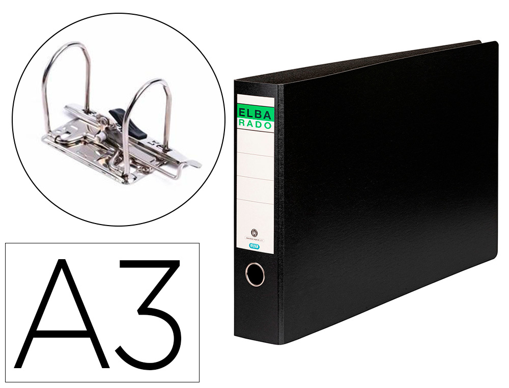 Descripción detalladaArchivador de cartón compacto, extraduro y resistente. Etiqueta en el lomo. Mecanismo de palanca. Con Rado®. Ancho del lomo 80 mm. 2 anillas. Color negro liso. Formato DIN A3 apaisado. Medidas: 480 x 320 mm.