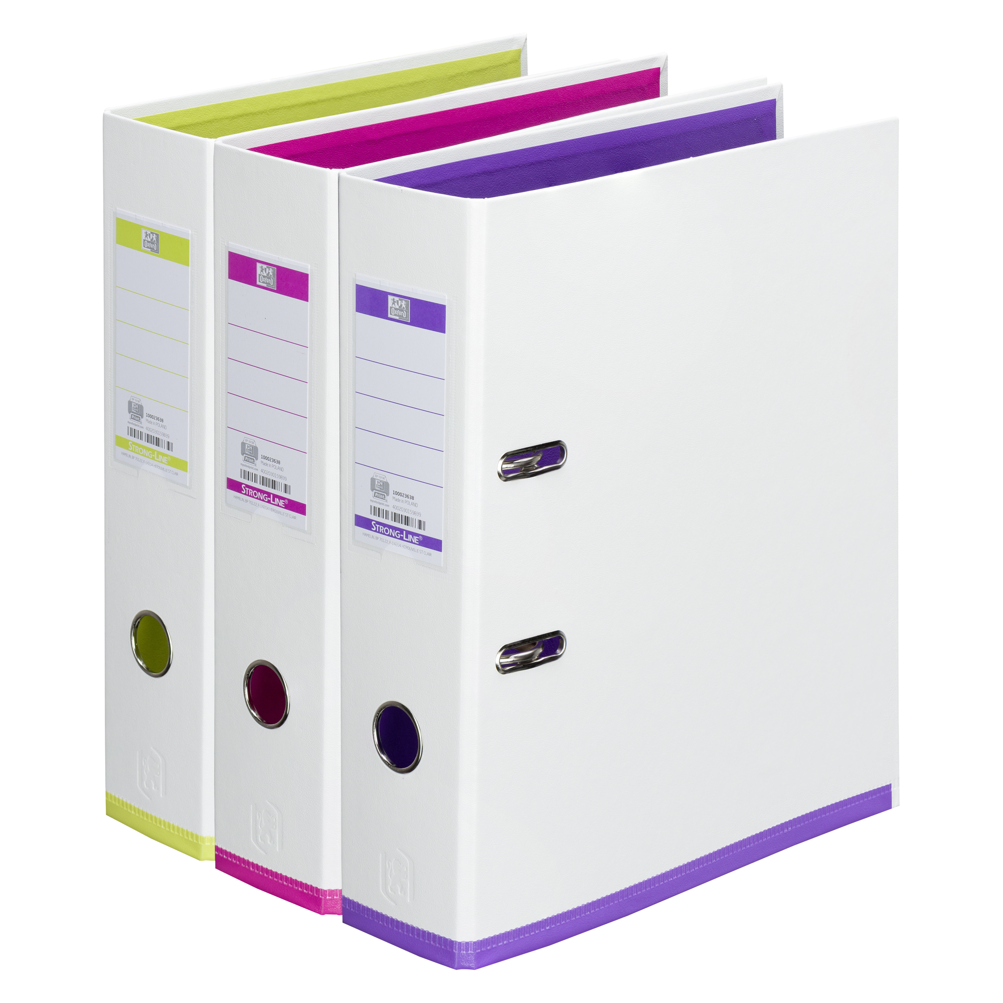 Archivador con color interior y exterior blanco. Mecanismo de fácil apertura. Cartón fuerte de 220 g recubierto de polipropileno. Bordes internos reforzados con polipropileno de colores. Porta-etiquetas con etiqueta extraíble. Orificio de agarre y compresor de metal. Formato Alt. 31,8 x An. 29 cm. Lomo de 8 cm. Surtido de 3 colores: exterior blanco, interior de colores (3 violetas, 3 rosas y 4 verdes).
