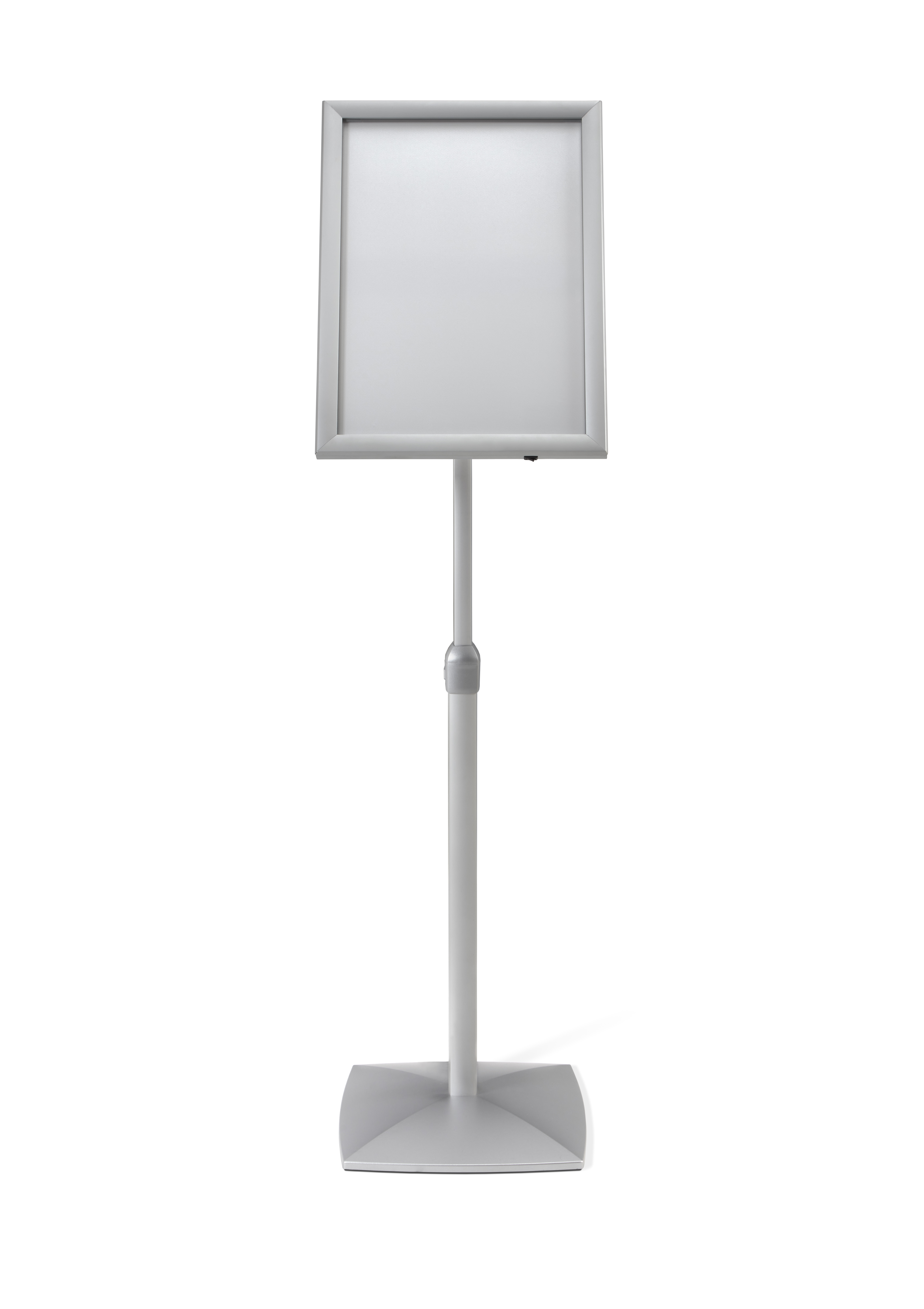 Atril informativo porta pósters Din A4 . Material: Perfil de aluminio anodizado plata de 25mm. trasero de plástico y frontal transparente antireflex. Mantenimiento: Limpiar con un paño húmedo y detergente neutro tipo limpiacristales. Secar con un paño seco.