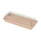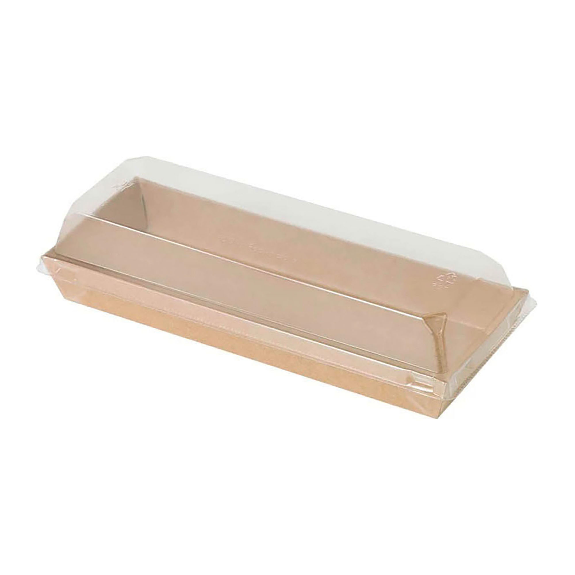 Bandeja para sushi de cartón kraft marrón con tapa de plástico PET transparente incluida, ideal para presentar tus creaciones culinarias.