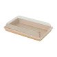 Bandeja para sushi de cartón kraft marrón con tapa de plástico PET transparente incluida, ideal para el servicio en restaurantes y catering. Con dimensiones de 22,5x13,8x2,5 cm, ofrece una presentación atractiva y funcional. Fabricada en papel reciclable, es una opción ecológica que combina estética y sostenibilidad, perfecta para aquellos que desean ofrecer un servicio de calidad sin comprometer el medio ambiente. Paquete de 300 unidades.