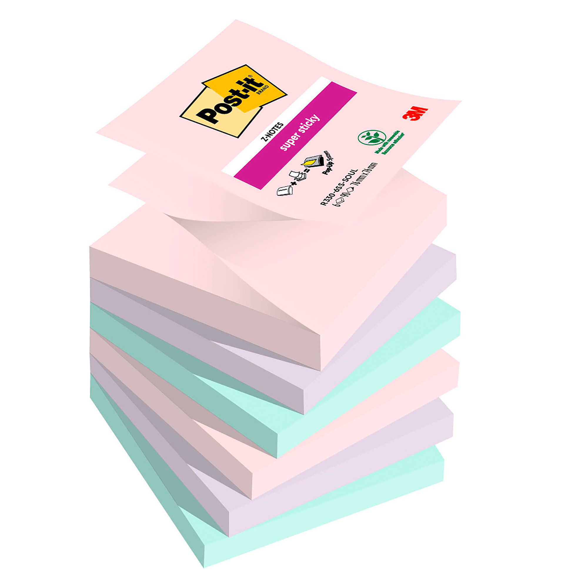 Descripción detalladaBloc de Z-Notas adhesivas reposicionables Post-it® Super Sticky. Colores surtidos Soulful: rosa claro, malva y menta.Formato 76 mm x 76 mm, Bloc 90 hojas. Certificación PEFC CH18/0914.