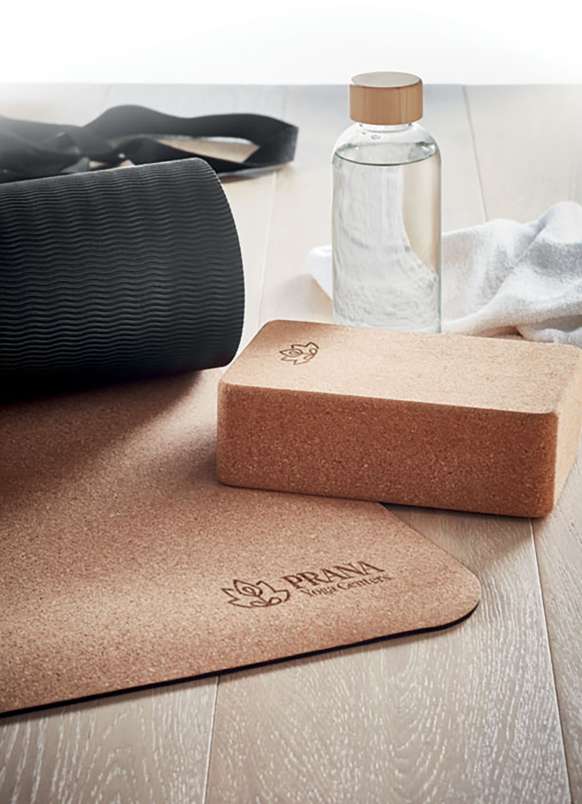 Bloque de yoga de corcho presentado en un envoltorio de papel.