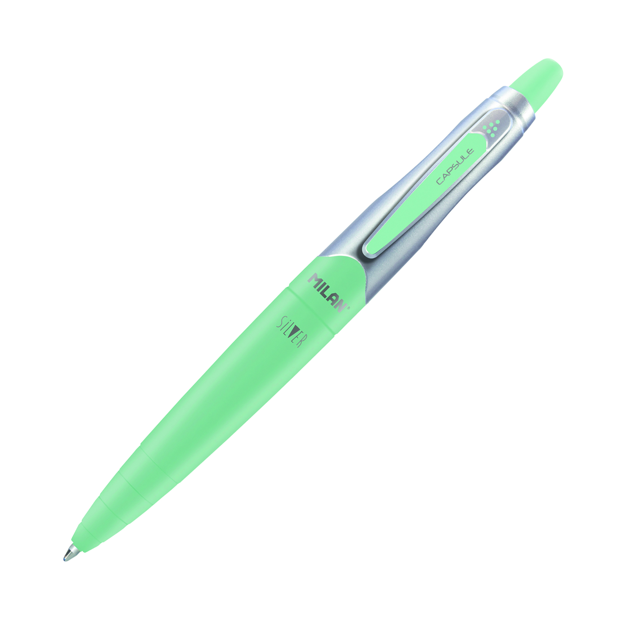 Bolígrafo Capsue Silver con tinta azul base aceite. Longitud de escritura aproximada de 1.000 metros. Punta 1 mm. Tinta fabricada en Alemania. Pulsador con retorno. Diseño original creado por el departamento de I+D de MILAN. Medidas bolígrafo: 13,4 x 1,6 cm. 1,4 cm. Colores surtidos aleatorios: azul marino, rosa, amarillo, turquesa.