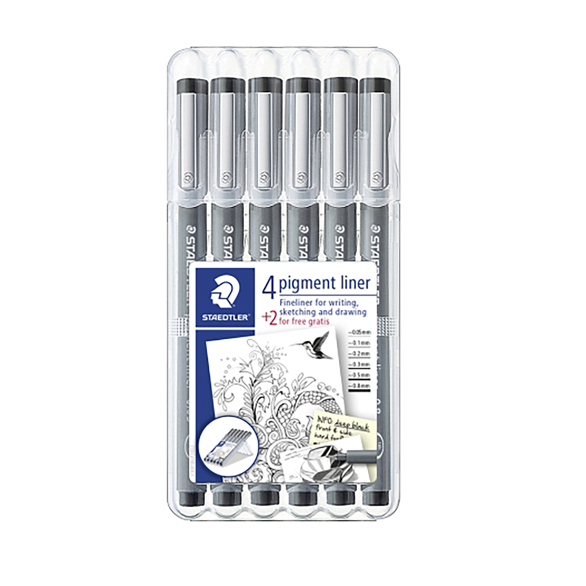 El pigment liner 308 es un marcador con tinta negra pigmentada y punta metálica ideal para escritura, bocetos y dibujos. Su tinta negra pigmentada es infalsificable (ISO 14145-2), resistente al agua, a la luz y a los marcadores, y es borrable en papel vegetal. Puede permanecer abierto durante 18 horas sin secarse (prueba ISO 554). Es perfecto para trazos con regla, plantillas y guías de letras. El producto se entrega en un estuche caballete con 6 puntas de escritura variadas: 0.05 mm / 0.1 mm / 0.2 mm / 0.3 mm / 0.5 mm / 0.8 mm.
