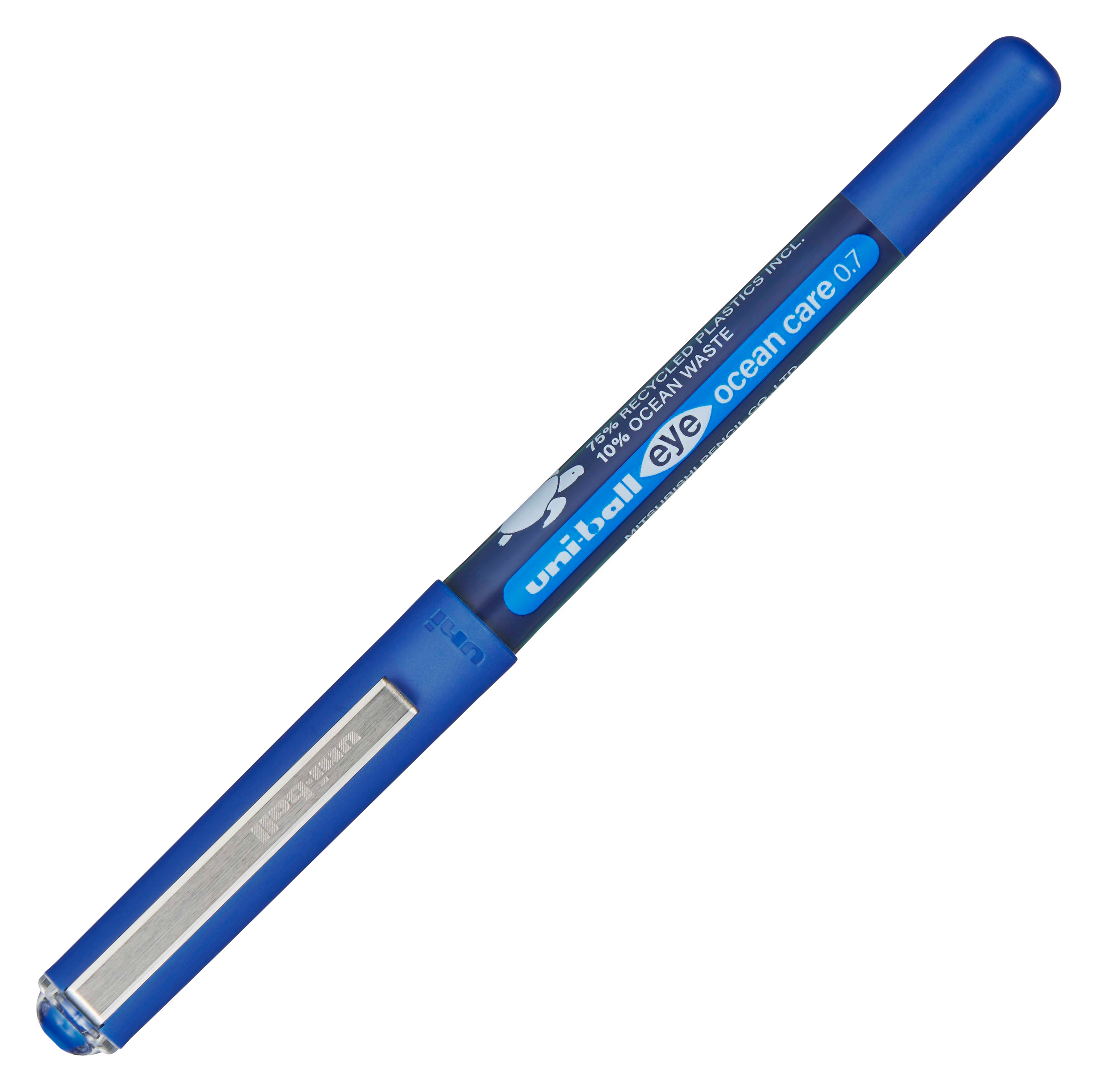 Rollerball de tinta líquida Uni-ball Eye OCEAN CARE. Punta de acero inoxidable. Bola de 0,7 mm de carburo de tungsteno. Tinta pigmentada de gran resistencia al agua y a la luz,su exclusivo sistema de control de tinta, evita el goteo y le confiere una increíble suavidad de escritura. Incorpora una ventana para controlar el nivel de tinta.