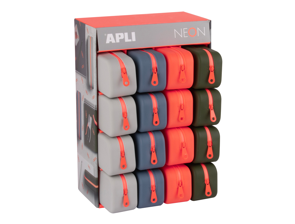 Estuche portatodo de silicona. Modelo Neon. Rectangular. Perfectos para guardar tus objetos con estilo. Expositor de 16 unidades colores surtidos Cada expositor contiene 16 estuches de tamaño 75 x 185 x 55 mm. Disponible en 4 colores surtidos: gris, azul, naranja y caqui. Cada estuche incorporaun detalle en naranja fluor, que añade energía y originalidad a tu espaci o de trabajo. Son funcionales, con cremallera repelente al agua, siliconade taco suave y su tamaño es adecuado para múltiples usos.