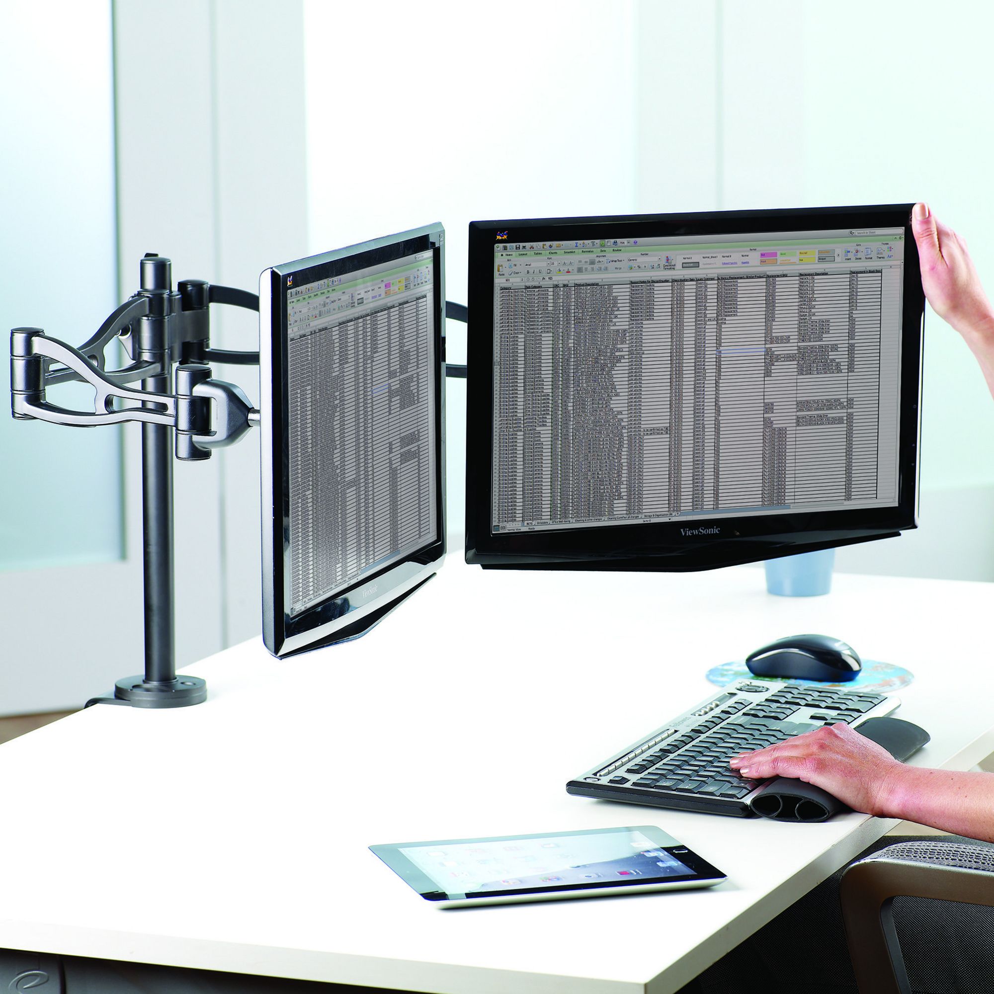 Soporte con brazo doble que permite colocar dos pantallas, reduciendo espacio y adaptando el puesto de trabajo a las necesidades del usuario. Ajustable en altura desde 8,9 cm a 41,9 cm. Regulable en profundidad (de 6,3 a 68,6 cm), permitiendo colocar la pantalla a una distancia óptima de visión. Permite inclinar la pantalla hacia arriba o hacia abajo + - 37 º y un giro de pantalla de 360 º. Válido para mesas entre 2,5 a 7,6 cm de grosor. Fácil de montar, con sistema de fijación de pinza o atornillado a la mesa. Cumple con especificaciones VESA. Soporta monitores de hasta 10 Kg.