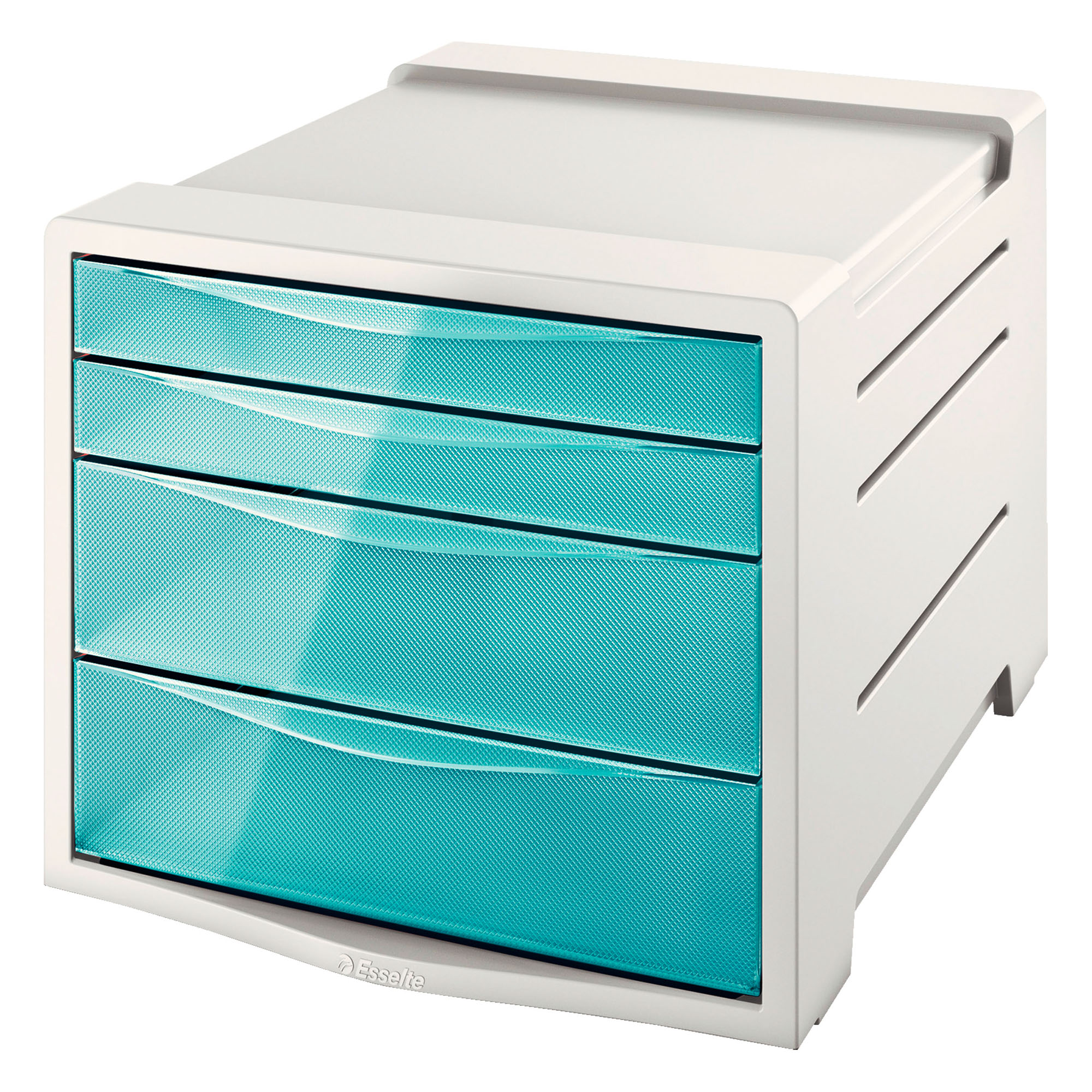 Organizador de escritorio con 4 cajones. Cuerpo color gris claro y cajones translúcidos. Dos cajones pequeños para guardar cosas pequeñas como bolígrafos, marcadores, reglas o documentos, y dos cajones grandes para guardar utensilios de mayor tamaño. Cajones de suave deslizamiento con tope. Frontal cerrado para mayor privacidad. Base con goma antideslizante. Para complementar con otros productos de la gama Colour'Breeze .