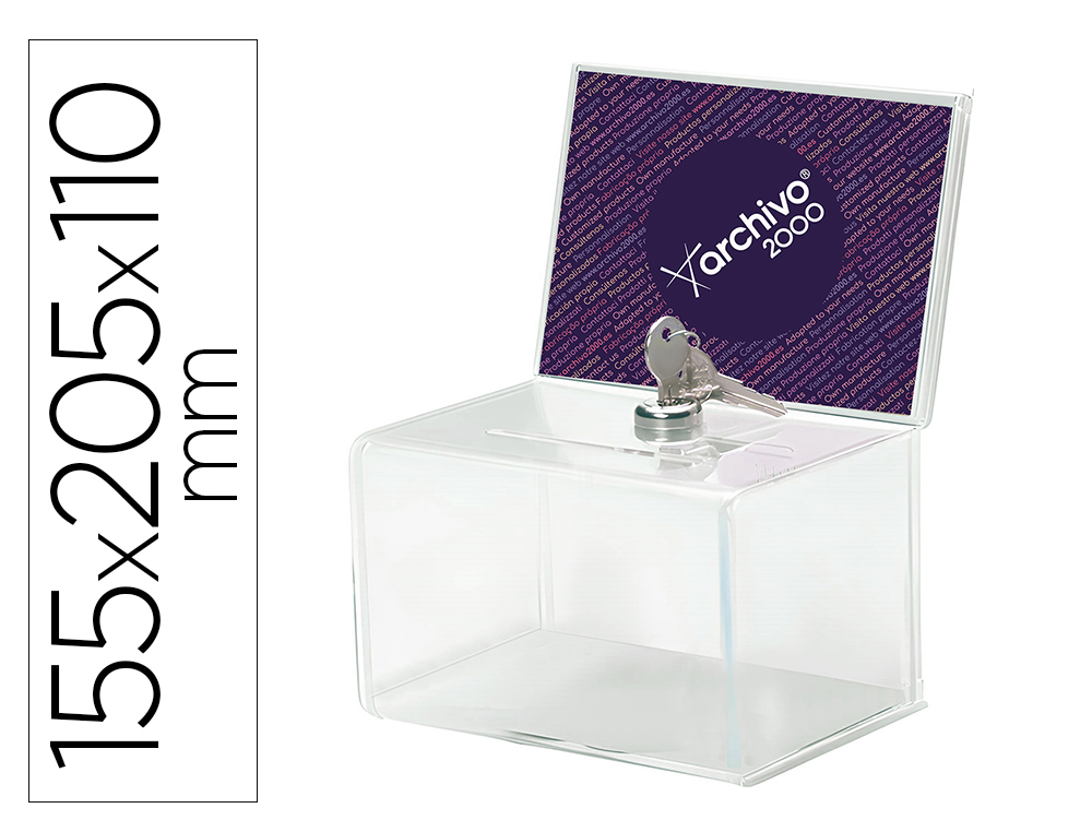 Buzón de sugerencias personalizable Archivo 2000 con llave y cerradura metálica. Fabricado en metacrilato ultra grueso de gran calidad y resistencia. Con ranura de 89 x 6,4 mm para introducir documentos como encuestas, votaciones y sugerencias. Parte trasera para personalizar con folleto de 152 x 102 mm. Ideal para colocar en recepciones como punto de información, sugerencias o donaciones. Color cristal transparente. Medidas exteriores: 155x110x205 mm. Fabricado en España.