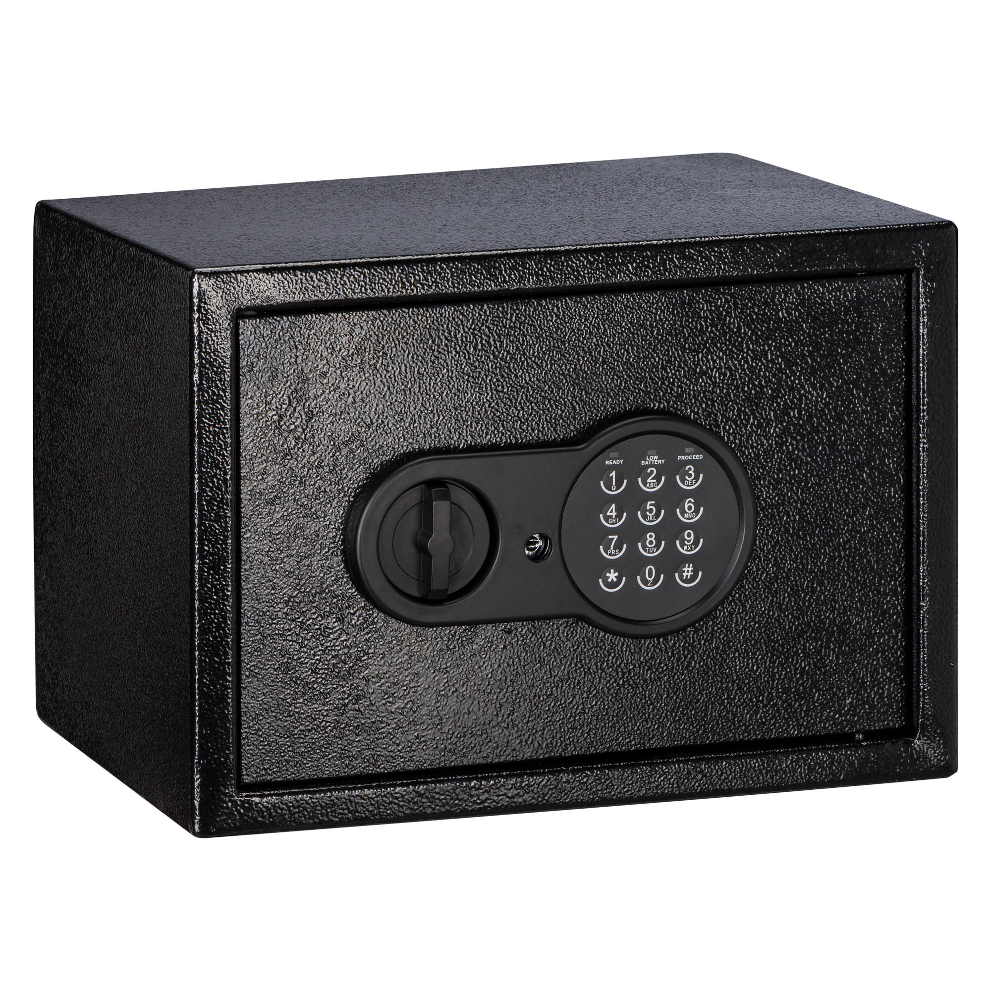 Ventajas: Económicos y compactos. Cerradura electrónica con llaves de emergencia (pilas suministradas). Puntos clave: chapa de acero, puerta 4 mm, cuerpo 2 mm. Puerta equipada con 2 clavijas. Apertura de la puerta 90°. 2 orificios para empotramiento mural y en suelo (se proporcionan tornillos). Acabado lacado en gris oscuro. Capacidad 16,5 L . Peso 9,5 kg. Medidas: Alt 25 x An 35 x Fon 25 cm.