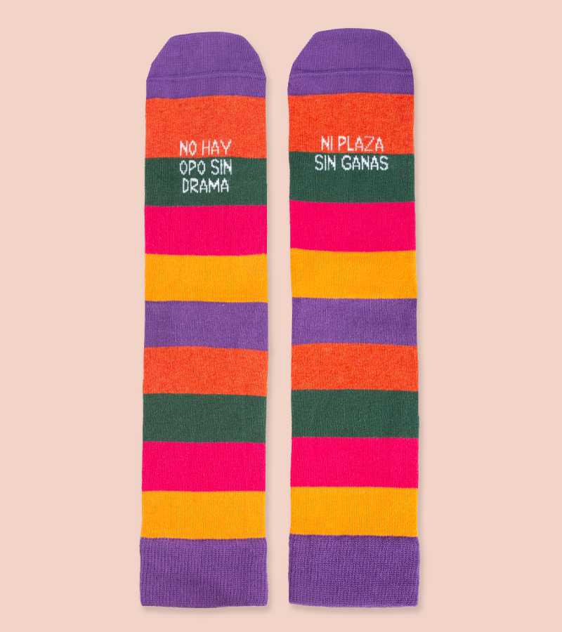 Opositar es cuestión de actitud. Porque por muchos dramitas que surjan en tu día a día (que los tienes, lo sabemos), las ganas por cumplir tu sueño se llevan todo por delante. Hemos diseñado estos calcetines especialmente para amenizar los días de opozulo. Y recuerda: ¡no hay opo sin dramas, ni plaza sin ganas!