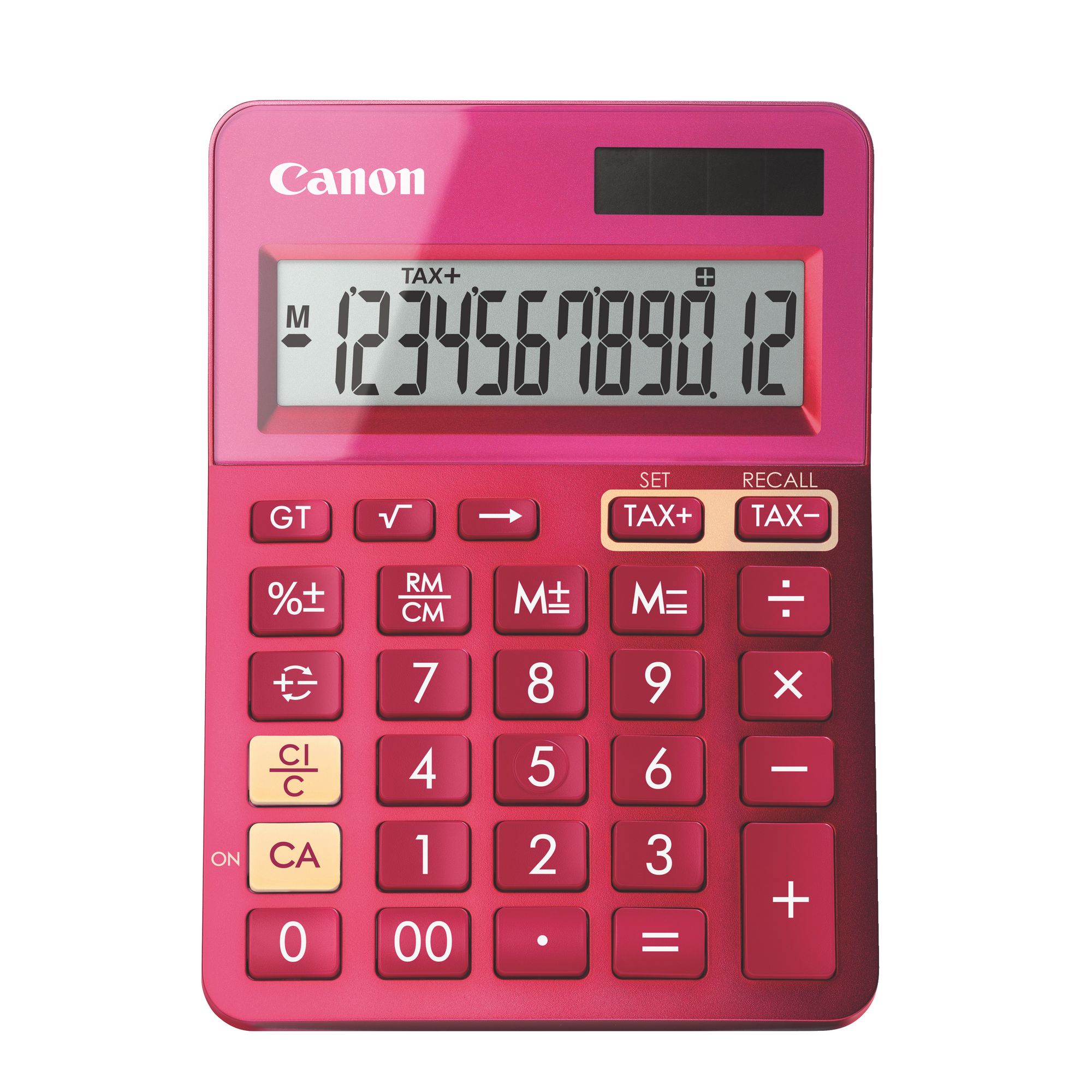 Calculadora de sobremesa con pantalla LCD grande 12 dígitos. Cálculo de impuestos. Tecla gran total. Cuerpo delgado con colores de moda . Alimentación pilas y solar. Fabricada parcialmente con materiales reciclados de Canon. Dimensiones: 145 x 104 x 25 mm. Peso: 119 g.