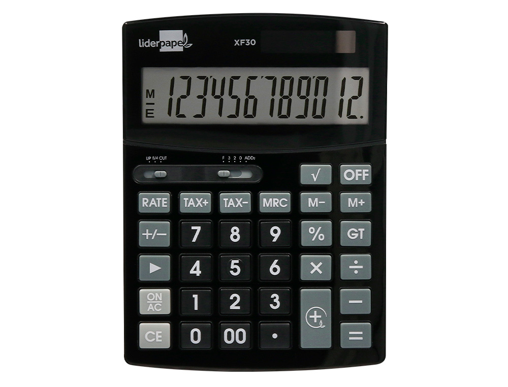 Calculadora de sobremesa grande de 12 dígitos. Teclas de encendido y apagado, doble cero, tasas y ratio. Funciones de redondeo decimal y posición decimal, GT, raíz cuadrada, porcentaje, suma y resta de memoria. Solar y a pilas. Funciona con pilas LR44. Color negro. Medidas: 190 x 140 x 30 mm. Peso: 340 g.