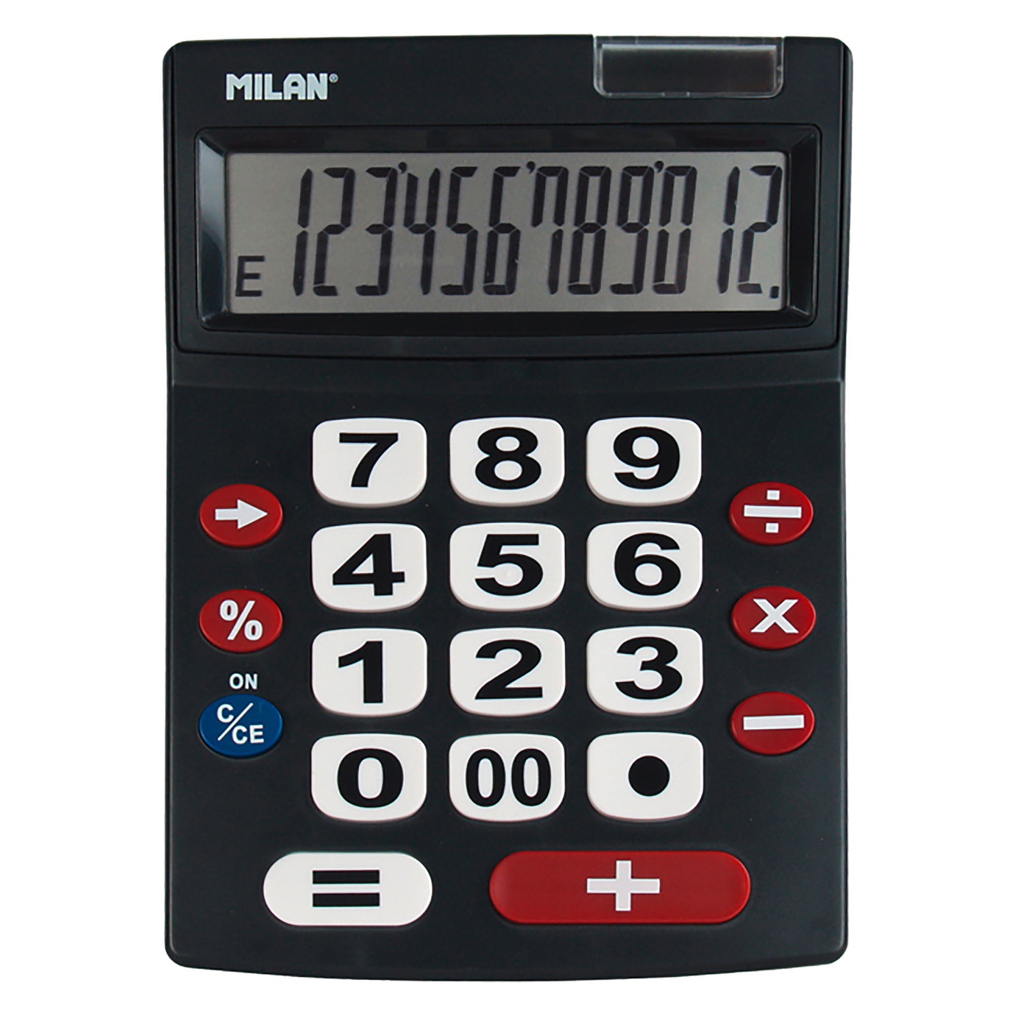 Calculadora de sobremesa extra-grande, de 12 dígitos y teclas grandes. Tecla de rectificación de entrada de datos. Alimentación dual: célula solar y pila de 1,5 V. Apagado automático. Medidas calculadora: 22,5 x 14 x 3 cm. Color negro con detalles rojos y blancos.