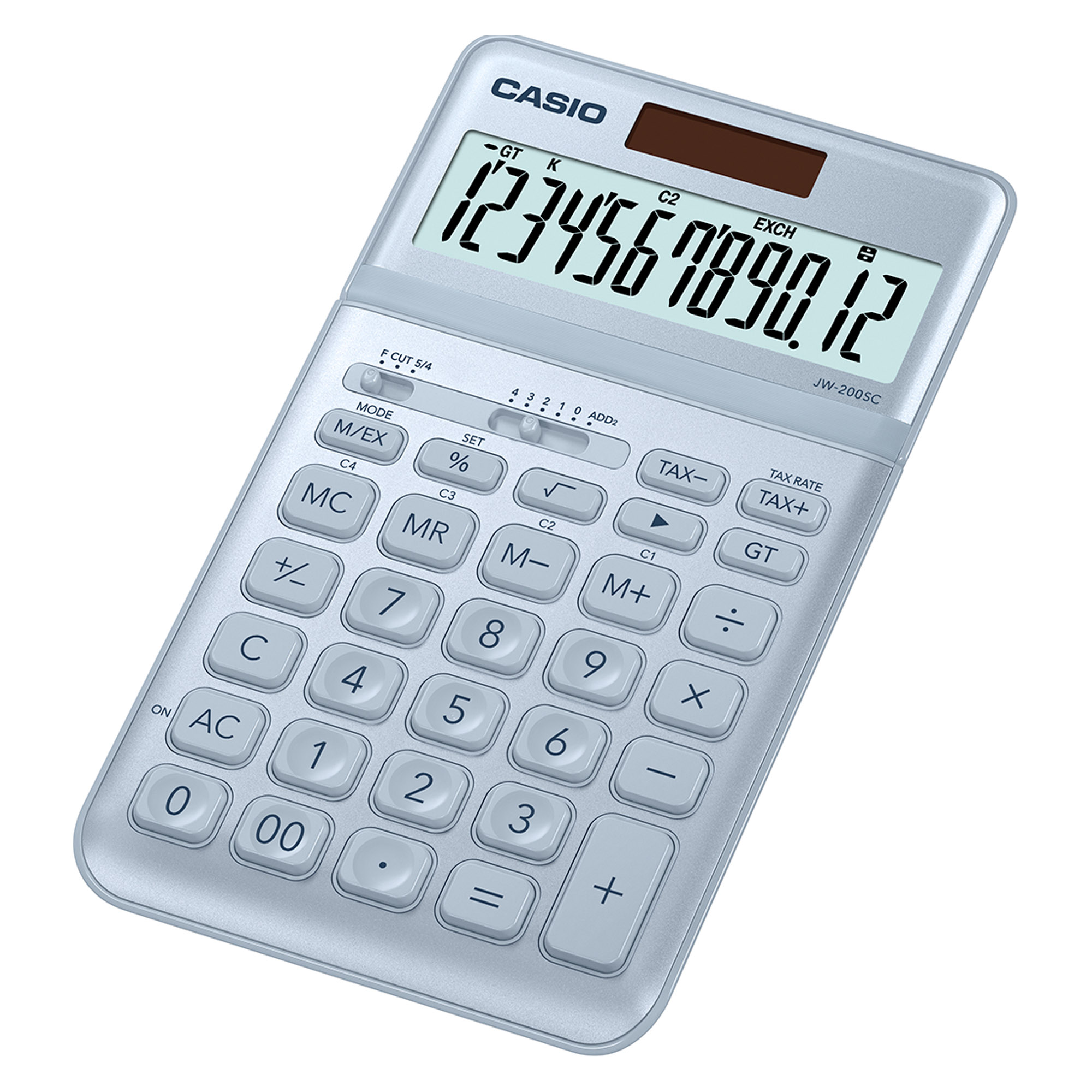Calculadora de sobremesa con diseño elegante. Pantalla inclinable LC extragrande de 12 dígitos. Cálculo de porcentaje profesional. Margen de beneficio a través de tecla %. Conversiones de moneda. TAX-Cálculo. Memoria de 4 teclas. Marcadores de coma de 3 dígitos. Selector de redondeo (0, 1, 2, 3, 4, ADD2). Redondeo automático (F, CUT, 5/4). Tecla de retroceso. Raíz cuadrada. Tecla doble cero. Alimentación solar/pila.