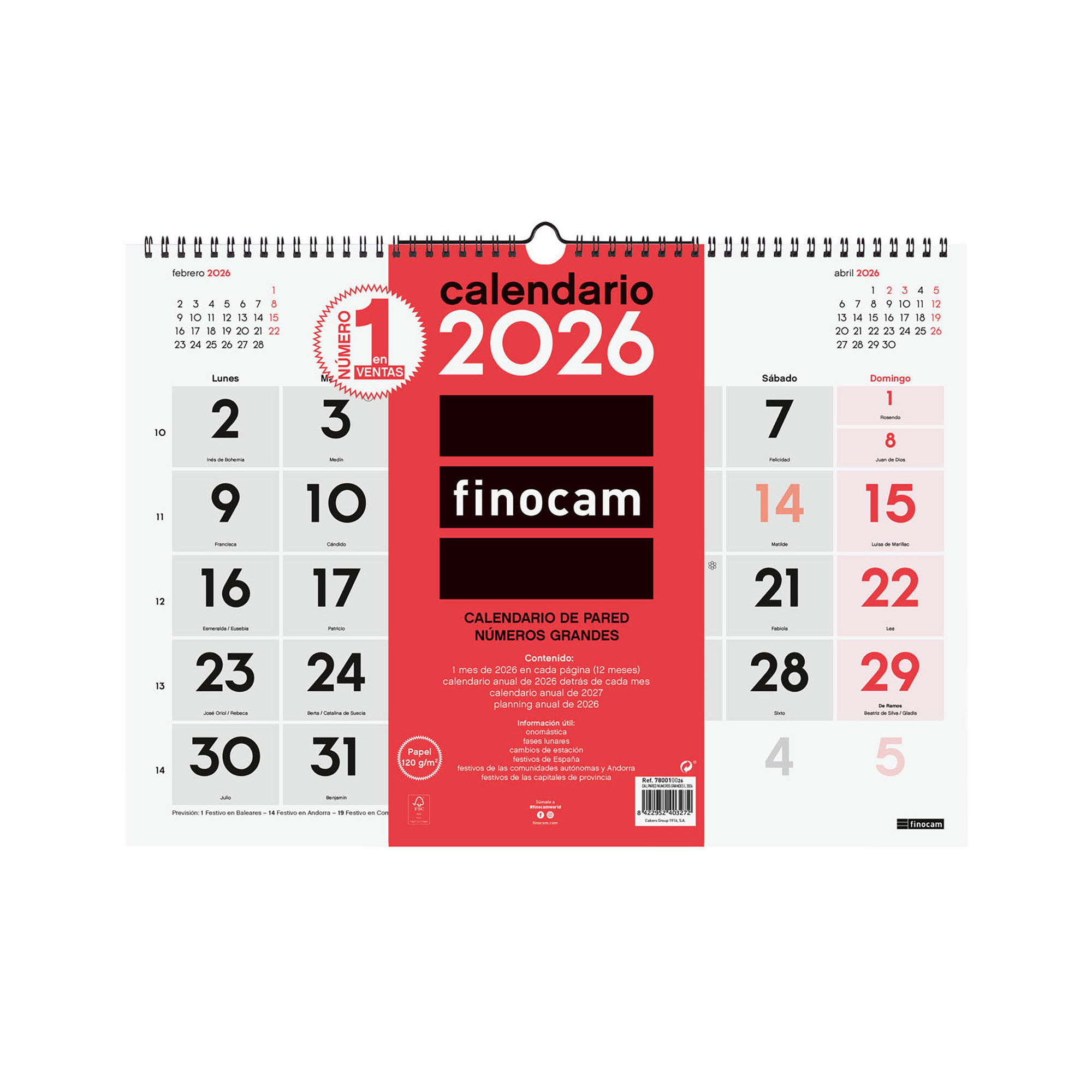 Calendario anual de pared con números grandes para una visión rápida del mes. Con mes anterior y posterior en cada página. Encuadernado con doble espiral y con colgador.