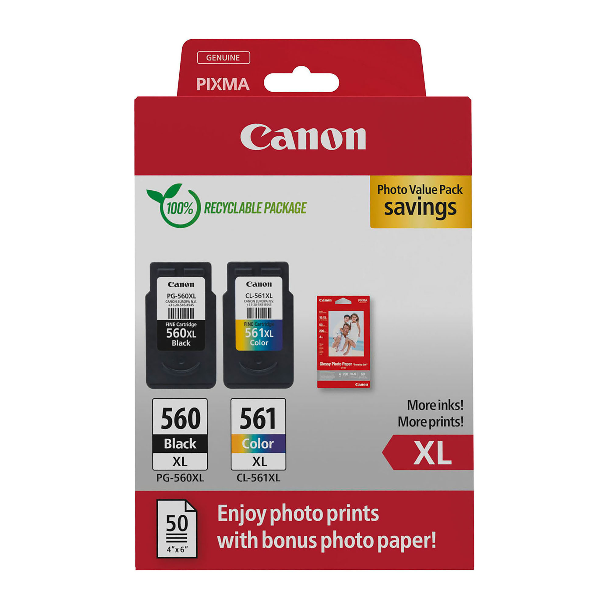Canon PG-560XL + CL-561XL Pack cartuchos originales alta capacidad negro + tricolor + papel foto 10x15 cm