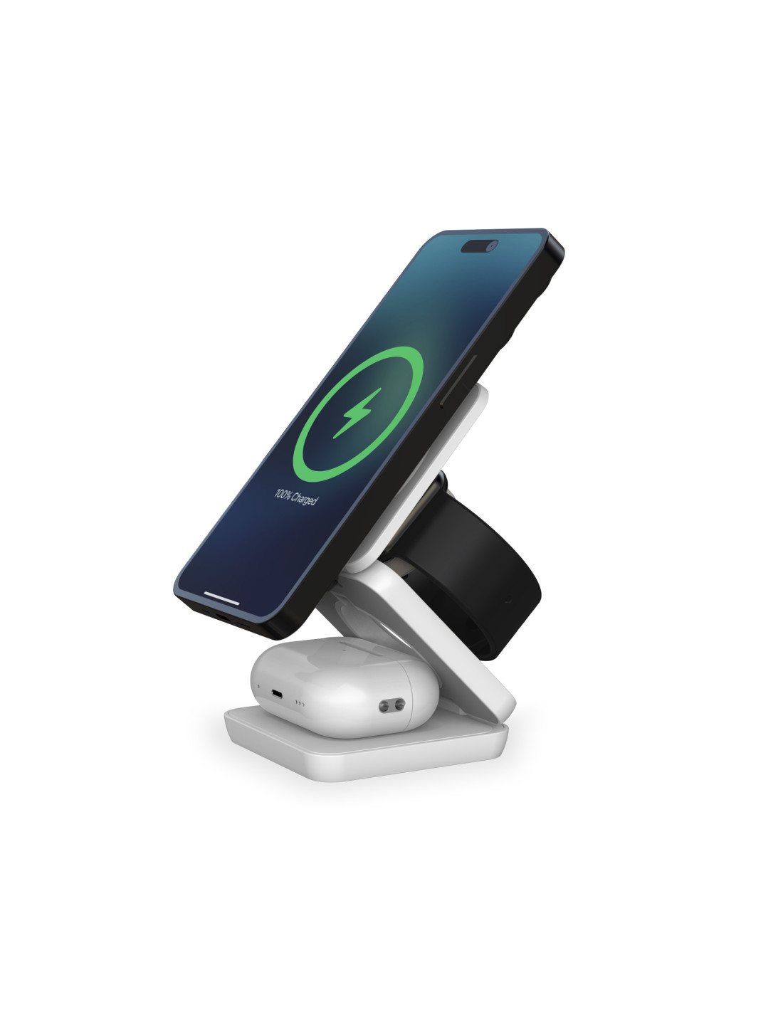 El Cube 3en1 integra tres bases de carga distintas. La base inicial y superior es compatible con smartphones Qi, además de ofrecer sujeción magnética compatible con la tecnología MagSafe® de Apple. La base central está específicamente diseñada para cargar tu Apple Watch. Y la tercera base es compatible con AirPods. Esta disposición innovadora te permite cargar al mismo tiempo tu smartphone, Apple Watch y AirPods, simplificando el proceso y eliminando la necesidad de múltiples cables y enchufes.