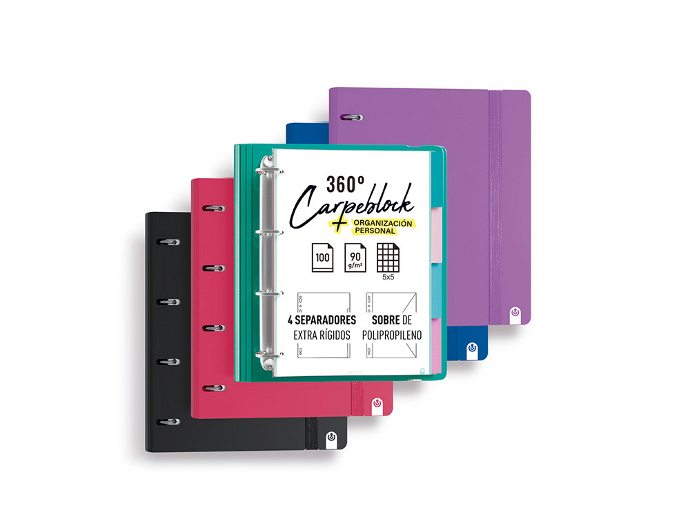 EL CARPEBLOCK 360º DE POLIPROPILENO FOAM DE CARCHIVO® ES EXTRA RÍGIDO Y ULTRA LIGERO, CON UN GROSOR DE 2 MM. EQUIPADO CON 4 ANILLAS MIXTAS DE 35 MM Y SISTEMA RADO, SU LOMO CURVO ERGONÓMICO PERMITE UNA APERTURA DE 360º. INCLUYE EL RECAMBIO BONUS DE 100 HOJAS CUADRICULADAS 5X5 DE 90 G/M² CON ORGANIZADOR DE CARCHIVO, UN SOBRE DE POLIPROPILENO CON SOLAPA Y CIERRE DE VELCRO PARA PEQUEÑOS OBJETOS. ADEMÁS, CUENTA CON GOMA PLANA A JUEGO Y 4 SEPARADORES. CARACTERÍSTICAS: MATERIAL: POLIPROPILENO FOAM 2 MM ANILLAS: 4 MIXTAS DE 35 MM EXTRAS: SOBRE DE PP, RECAMBIO DE 100 HOJAS, 4 SEPARADORES CIERRE: GOMA PLANA TAMAÑO: A4
