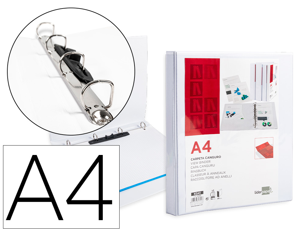 Carpeta fabricada en cartón forrado en plástico soldado de color blanco. 5 mm de grosor. Con funda transparente soldada en su interior. Carpeta con funda en la portada, contraportada y lomo que permite su personalización e identificación. Anillas mixtas. Con compresor metálico. Formato DIN A4. Medidas: 283 x 320 mm.