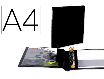 Apertura conjunta de las 4 anillas. Cierre con goma para un transporte seguro. El Exabinder está equipado de un bolsillo interior y de una funa Zip con taladros par aordenar y proteger pequeños objetos o doucmentos sueltos.