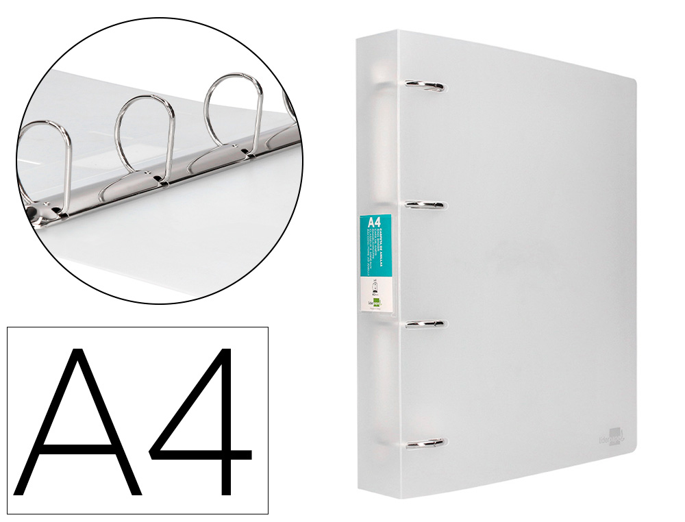 Descripción detalladaFabricada en polipropileno. Carpeta de anillas de con tarjetero. Ancho de lomo: 40 mm. Formato DIN A4. Medidas: 260 x 315 mm.