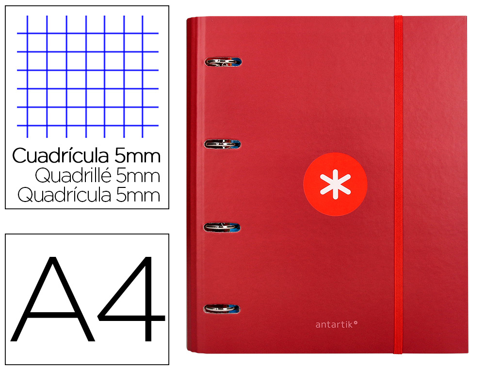 TAPA DE CARTÓN FORRADO DE 1,75 MM DE ESPESOR. FORRADA EN PAPEL ESTUCADO MATE DE 135 G/M² IMPRESO. PLASTIFICADA MATE CON DETALLES BARNIZ UVI. 4 ANILLAS REDONDAS. CIERRE DE GOMILLA. CON RANURAS PARA ANILLAS. 100 HOJAS CON 5 BANDAS DE COLOR Y 4 TALADROS. PAPEL INTERIOR EXTRABLANCO DE 90 G/M². ULTR ASUAVE. CUADRÍCULA DE 5 MM. FORMATO DIN A4. GUARDA INTERIOR IMPRESA. LOMO REDONDO, CON SEPARADOR INTERIOR Y SOLAPA.