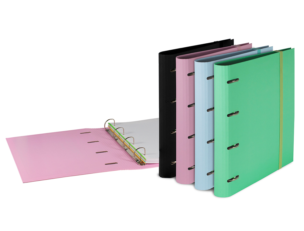 Descripción detalladaCarpeta de cartón forrado extra. 4 anillas de 35 mm. Bloc de 120 hojas. Acabado touch. Expositor de 8 unidades colores surtidos