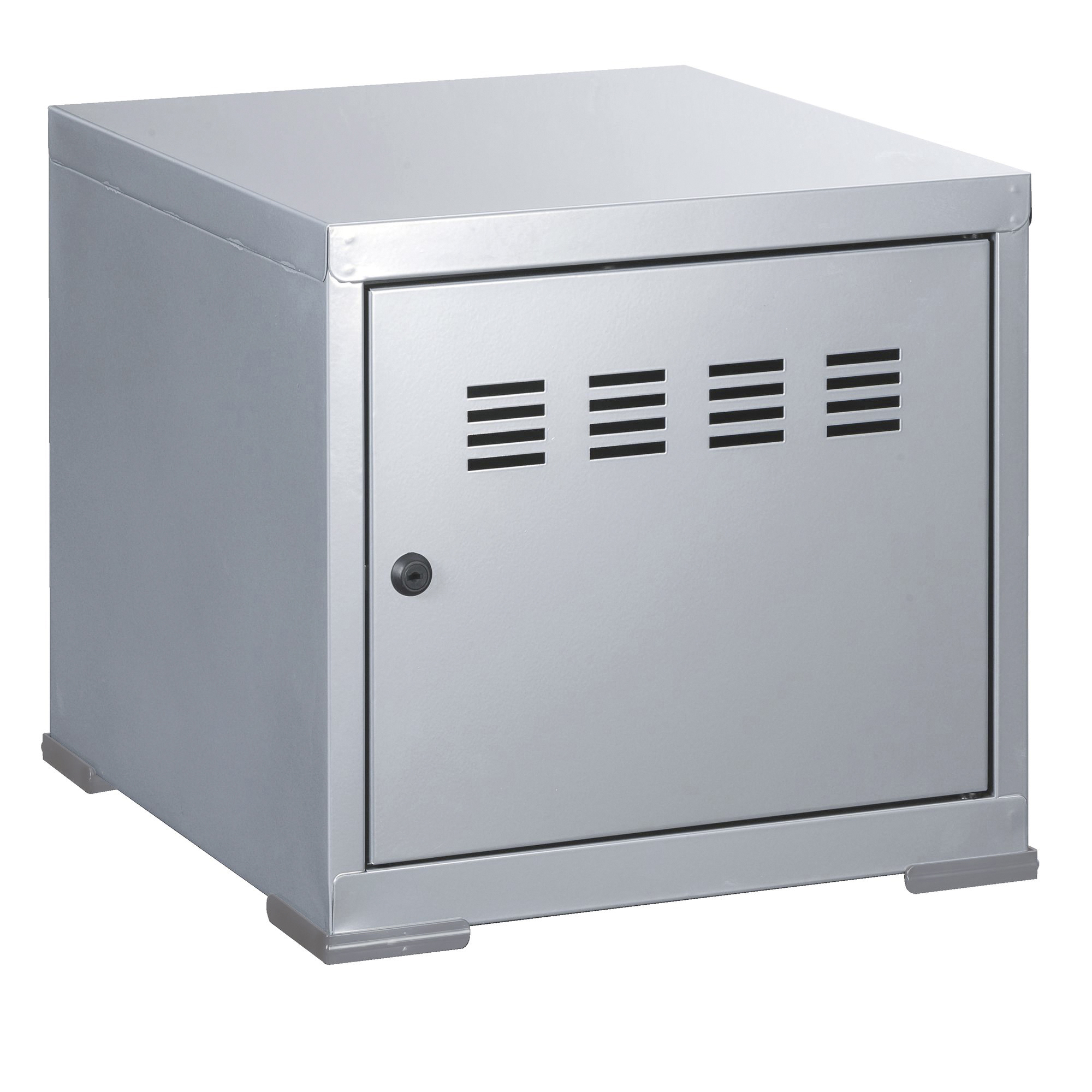 Estructura: chapa de acero 8/10º lacado epoxi. Puerta batiente con cerradura ( 2 llaves incluidas). Entregado con un kit de unión de plastico negro que permite apilar las modulos. Entregado montado. Kit de unión por fijar.
