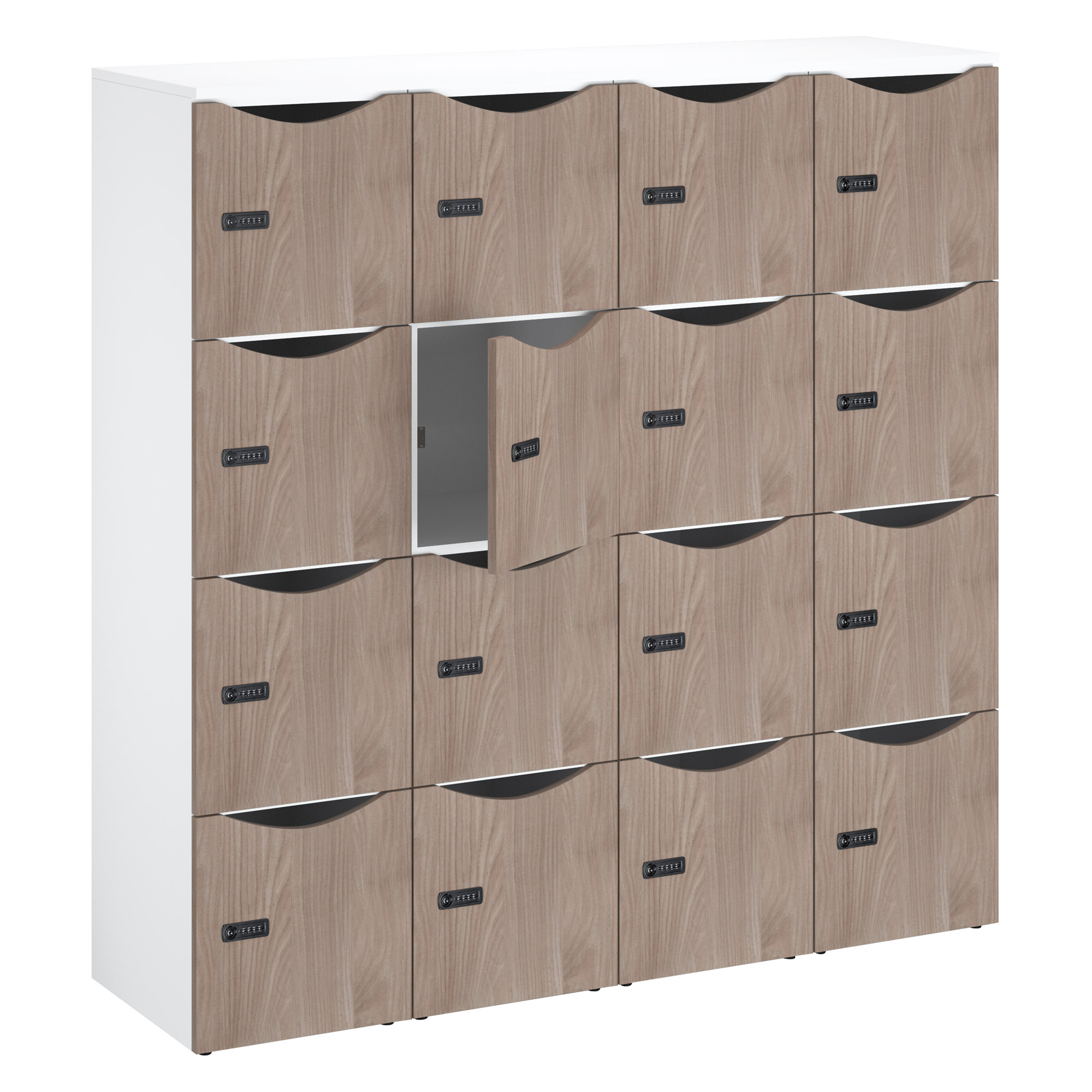 Casillero de 16 compartimentos que incluye 4 columnas de 4 compartimentos de 169 cm de altura, una parte superior de acabado de 1,9 cm y una llave de repuesto.