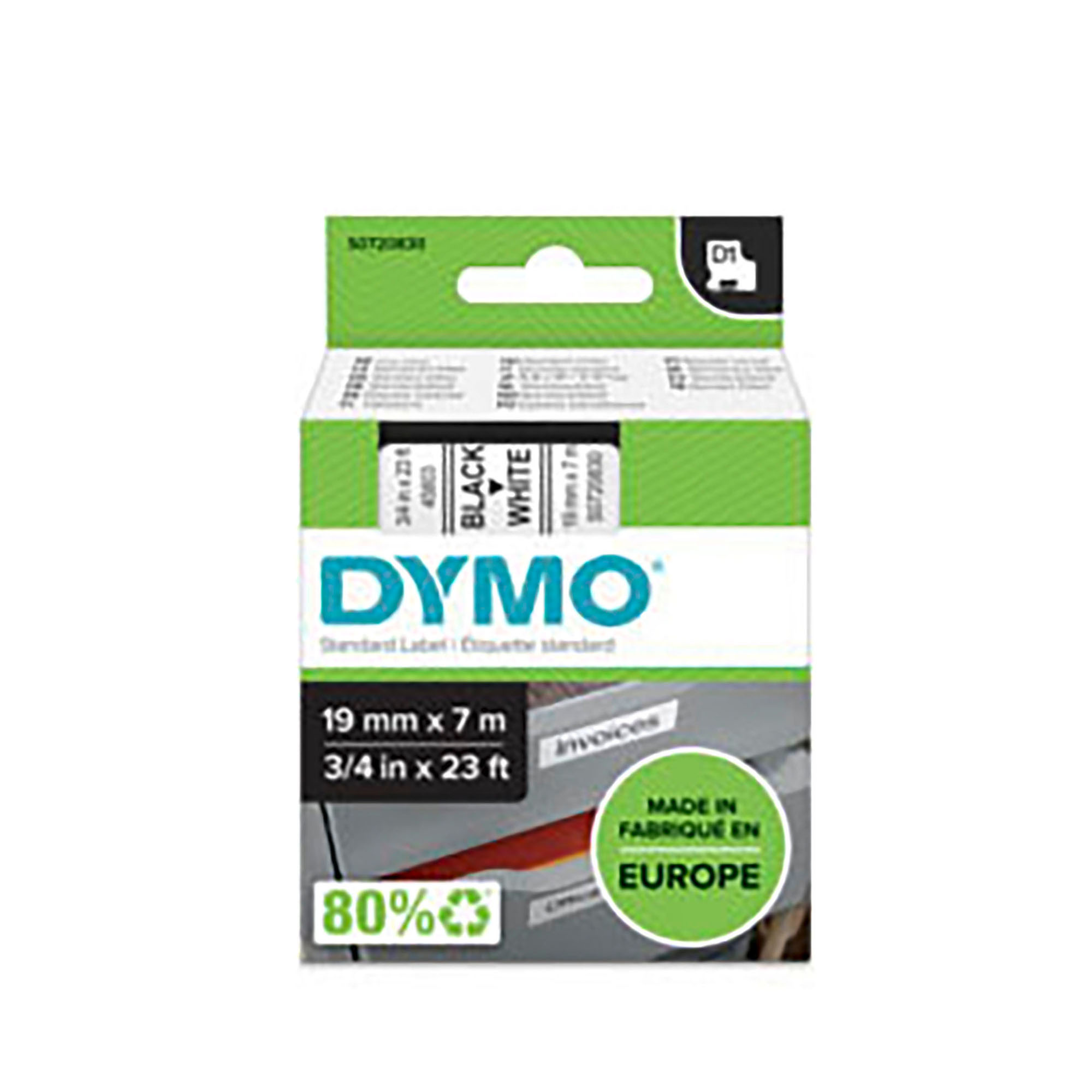 Cinta ancho 19 mm, largo 7 m, fondo blanco con escritura negra.