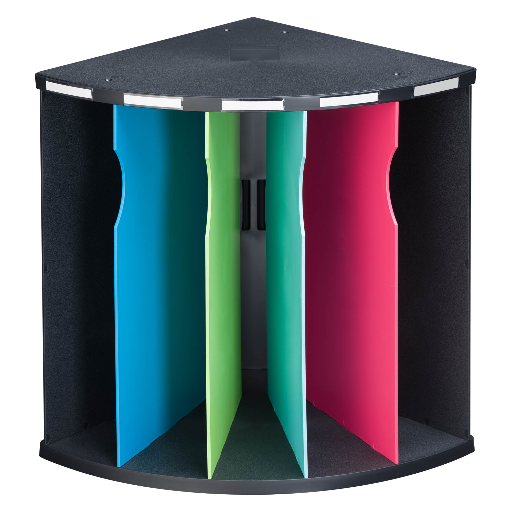 El clasificador ergonómico de 5 compartimentos Corner 1928 tiene forma de cuarto de círculo , lo que le permite aprovechar los rincones y ángulos no utilizados de su oficina.