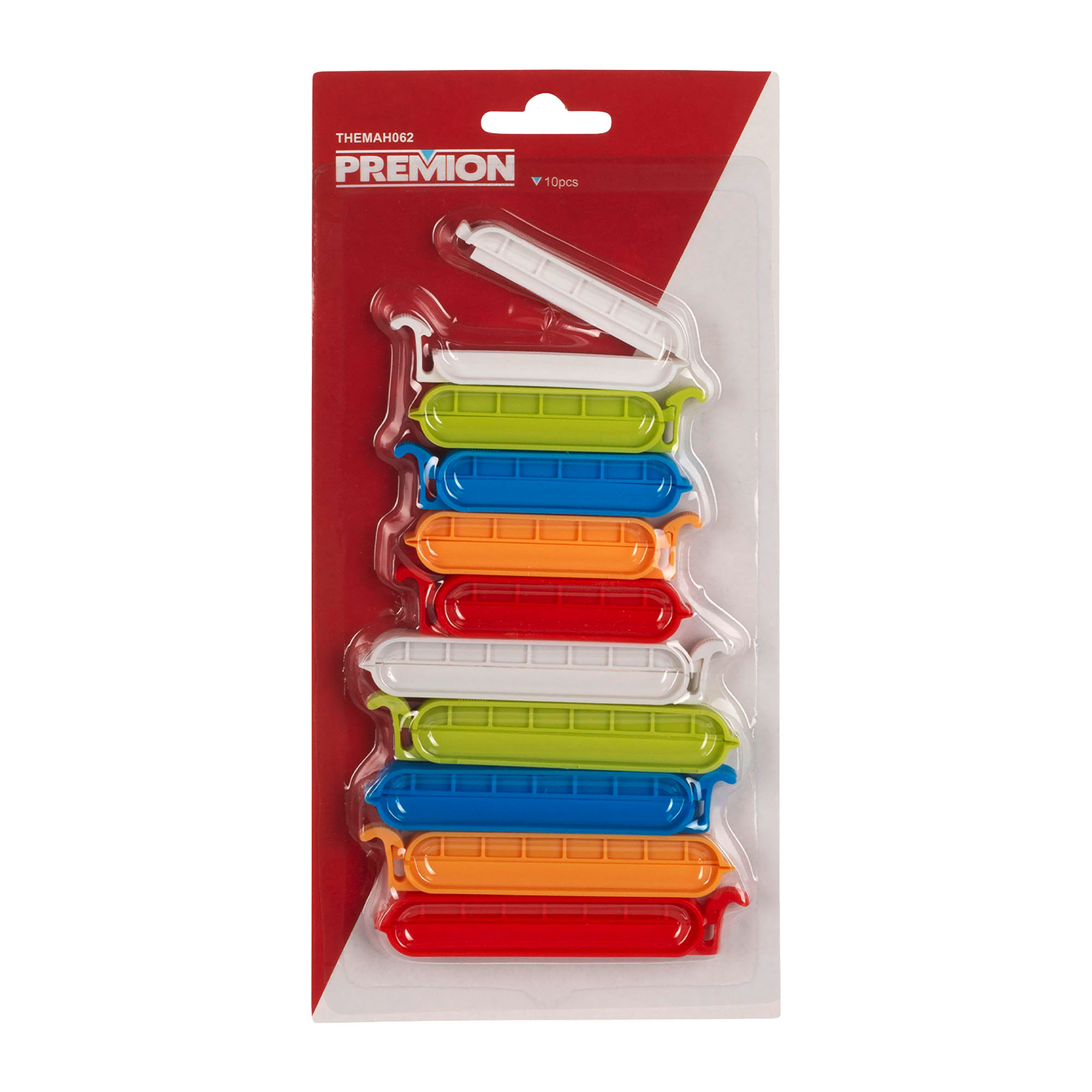 Descripción detalladaMantén la pasta, el pan y más frescos con estos clips para bolsas de Premion. El juego incluye 10 clips para bolsas en varios colores.2 formatos:5 clips de 102 mm x 171 mm x 13 mm 5 clips de 80 mm x 140 mm x 11 mm