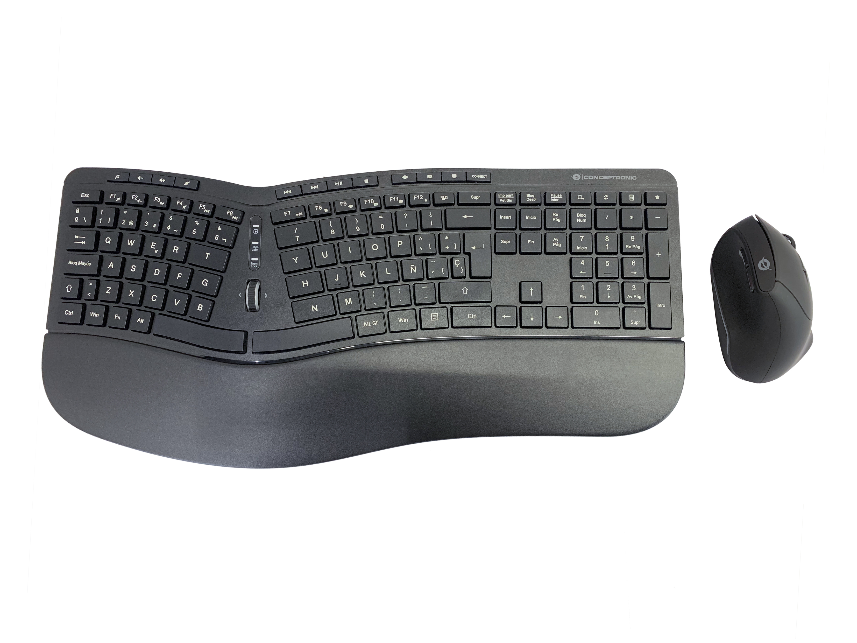 Conceptronic ORAZIO02ES. Formato del teclado: Completo (100%). Estilo de teclado: Curvo. Tecnología de conectividad: Inalámbrico, Interfaz del dispositivo: RF inalámbrico, Diseño de teclado: QWERTY, Teclado, cantidad de teclas: 125. Descansa muñecas. Uso recomendado: Oficina. Color del producto: Negro. Ratón incluido