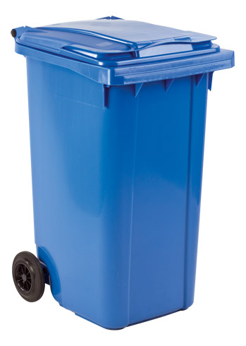 Muy manejable gracias a 2 ruedas anchas de caucho (Ø 200 mm) y el asa para transportarlo. Capacidad de 240 litros.