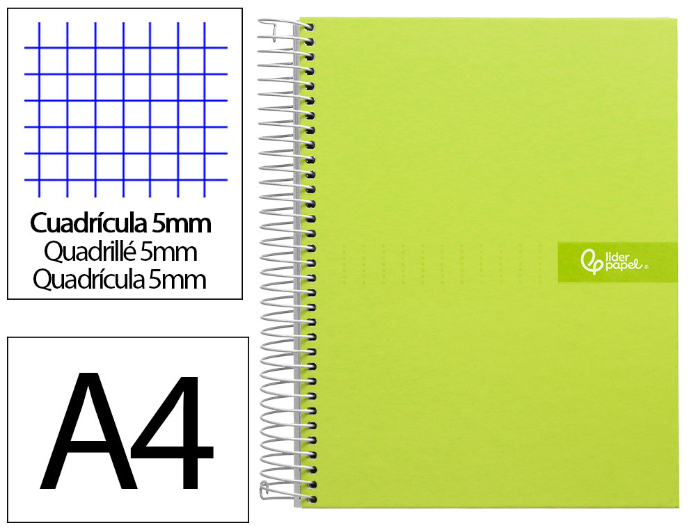 Cuaderno espiral liderpapel a4 micro crafty tapa forrada 120h 90gr cuadro 5mm 5 bandas 4 colores color verde